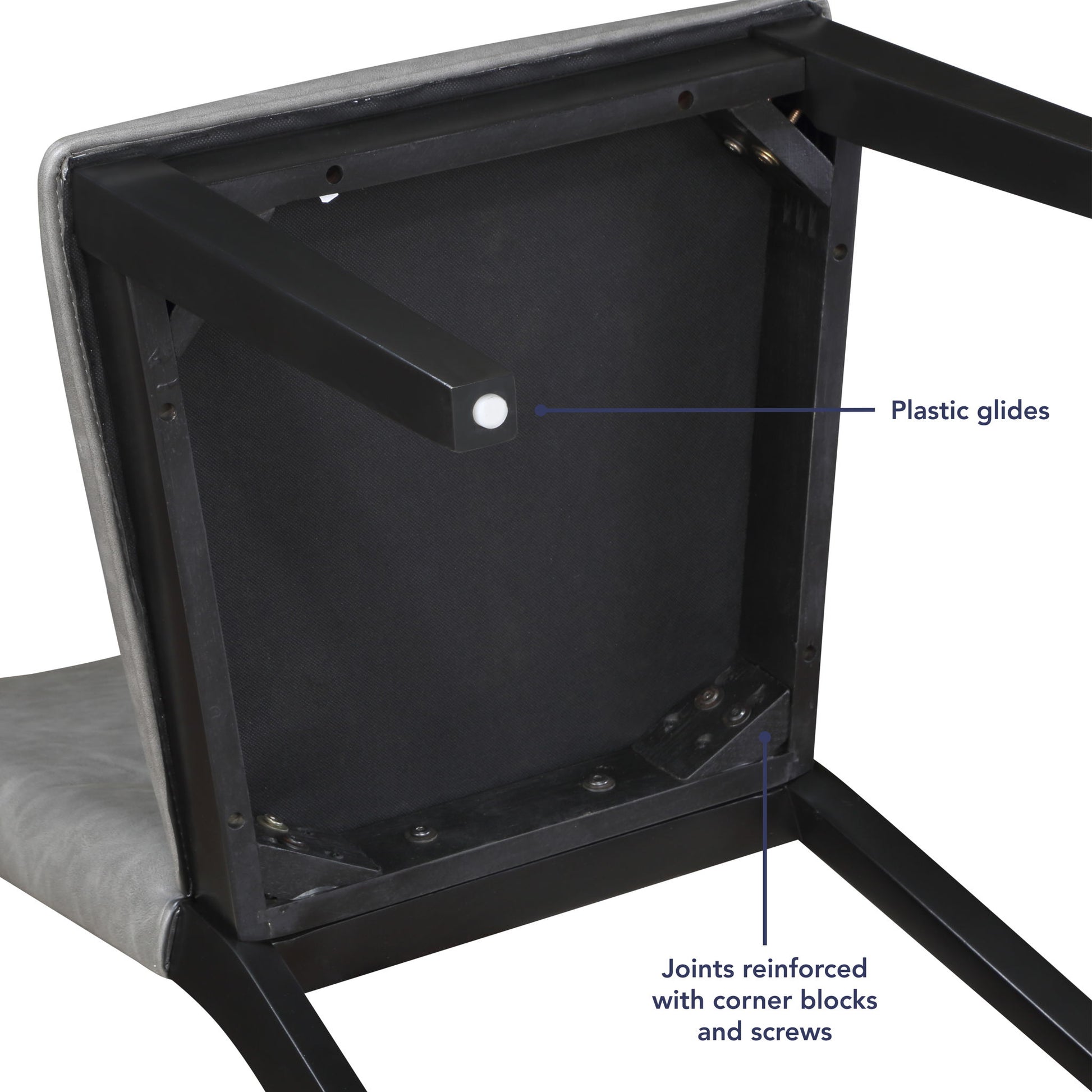 The Amy Side Chair brings a touch of mid century modern design to any dining setting. Upholstered in a moonlight gray faux-leather, this chair is built to last with corned blocked seat and solid wood legs. You will linger a little longer with the added comfort provided by the foam cushioning and memory foam topped seat while the ebony finished legs offer an elegant complement to the moonlight gray seat. Add to any setting for a sophisticated yet easy-to-maintain chair in a dining, office or living area.