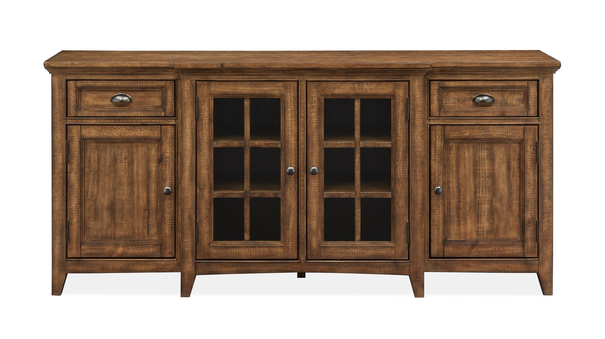 Bay Creek - Entertainment Console. 2 wood framed glass doors in the center. 2 adjustable Wood shelves behind the doors. 2 felt lined top side drawers. 1 adjustable Wood shelf behind each left and right wood door. Side mount ball bearing guides. Wire management. Set of power supply and USB charger.