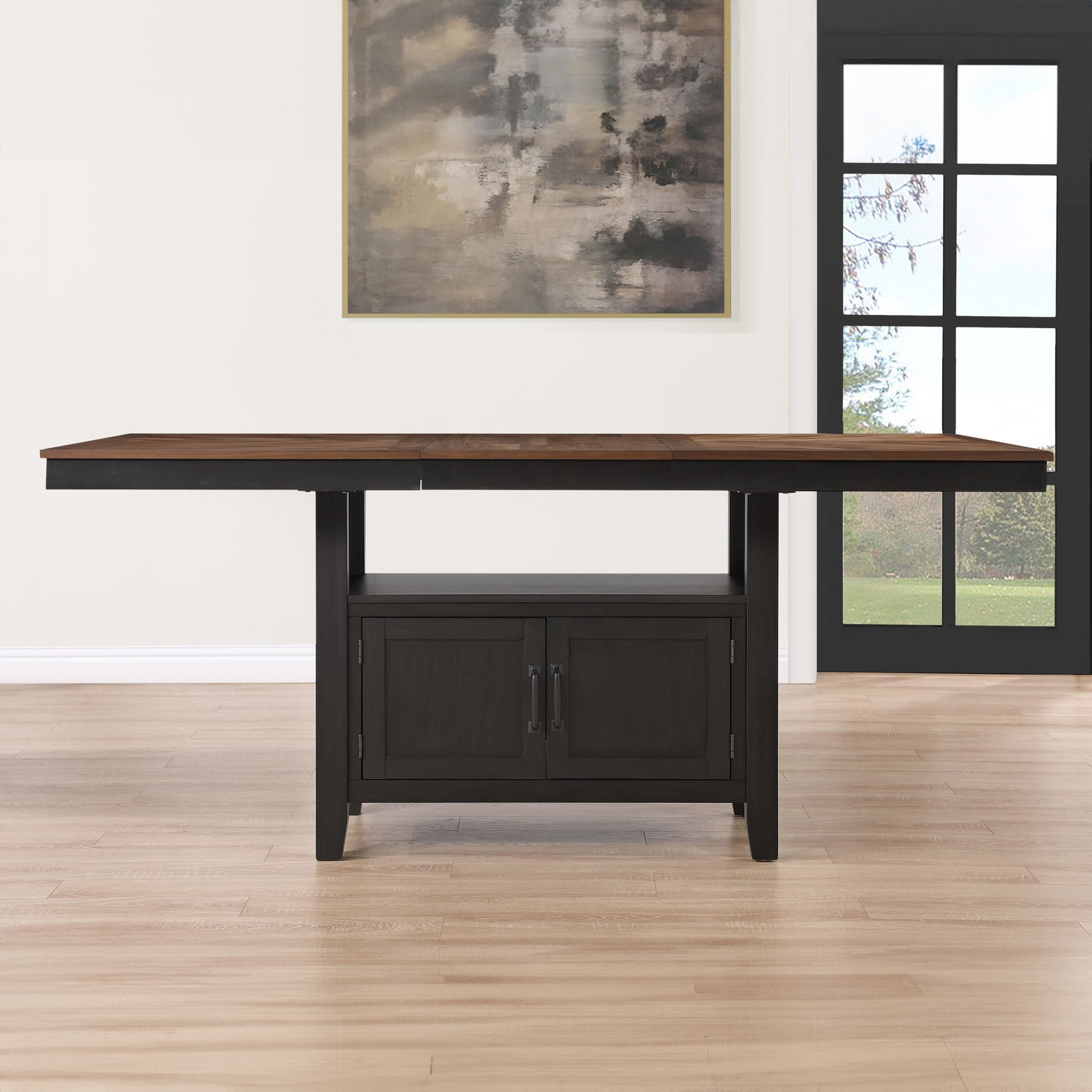 The Bermuda 60-80 Inch Storage Counter Table with 20 Inch Leaf offers modern farmhouse style with a contemporary edge. Featuring black and dark acacia finishes over acacia veneers and hardwood solids, this 36-inch high table is perfect for dining or working. The 20-inch leaf effortlessly converts it from a cozy 60-inch table to a spacious 80-inch one, accommodating up to eight guests. Tapered legs add elegance and stability, while the base provides generous storage with dual doors on both sides for easy access to essentials.