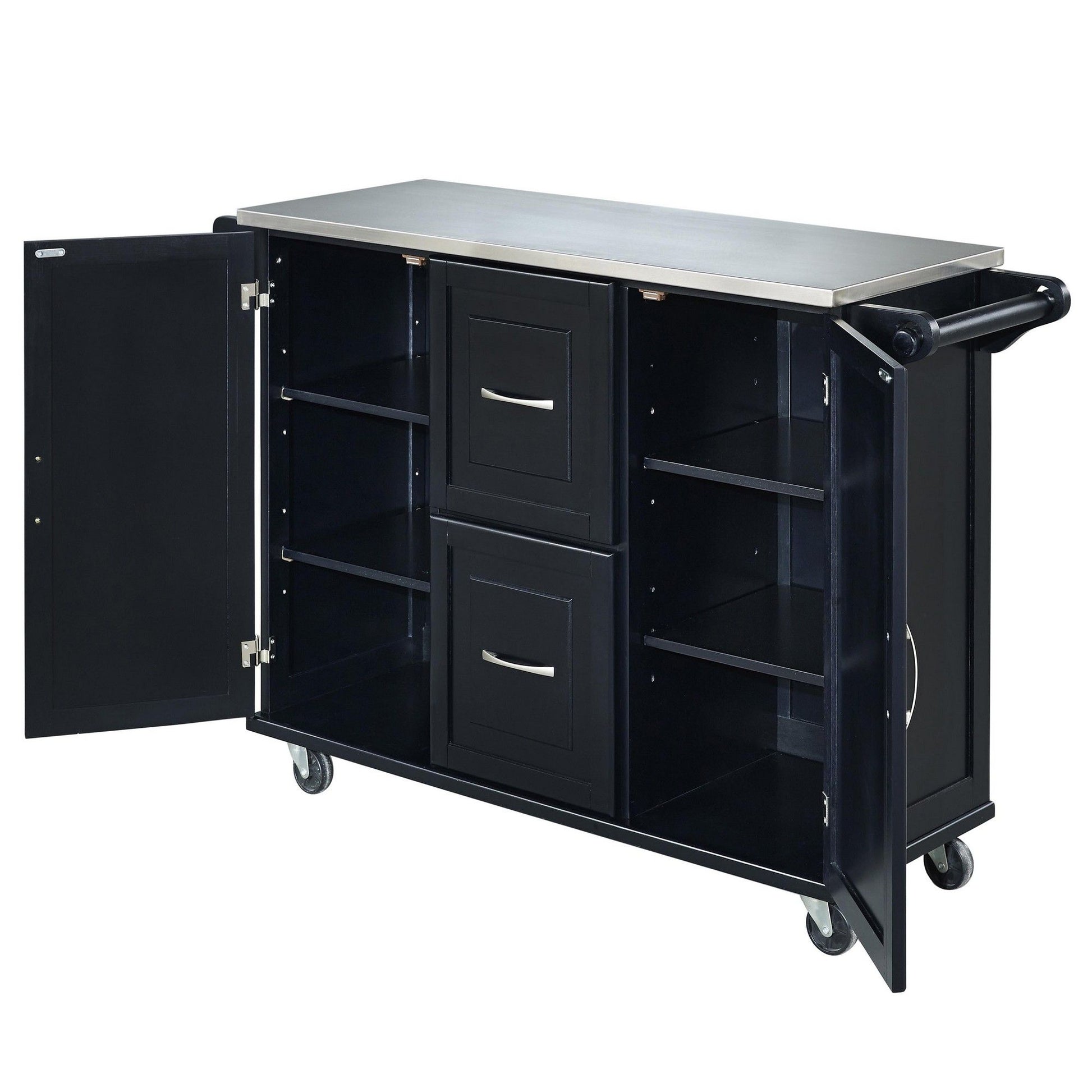 Enhance your kitchen area by adding the Blanche Kitchen Cart by homestyles. Constructed of solid hardwood and engineered wood in a finish with an 0.8 mm thick stainless steel top. Storage includes two single cabinet doors that open to reveal two adjustable shelves inside each, two deep storage drawers, a towel bar and spice rack. Features brushed nickel hardware and two locking casters. Finish and measurements may vary slightly. Assembly required. Size: 36"H x 53.5"W x 17"D.