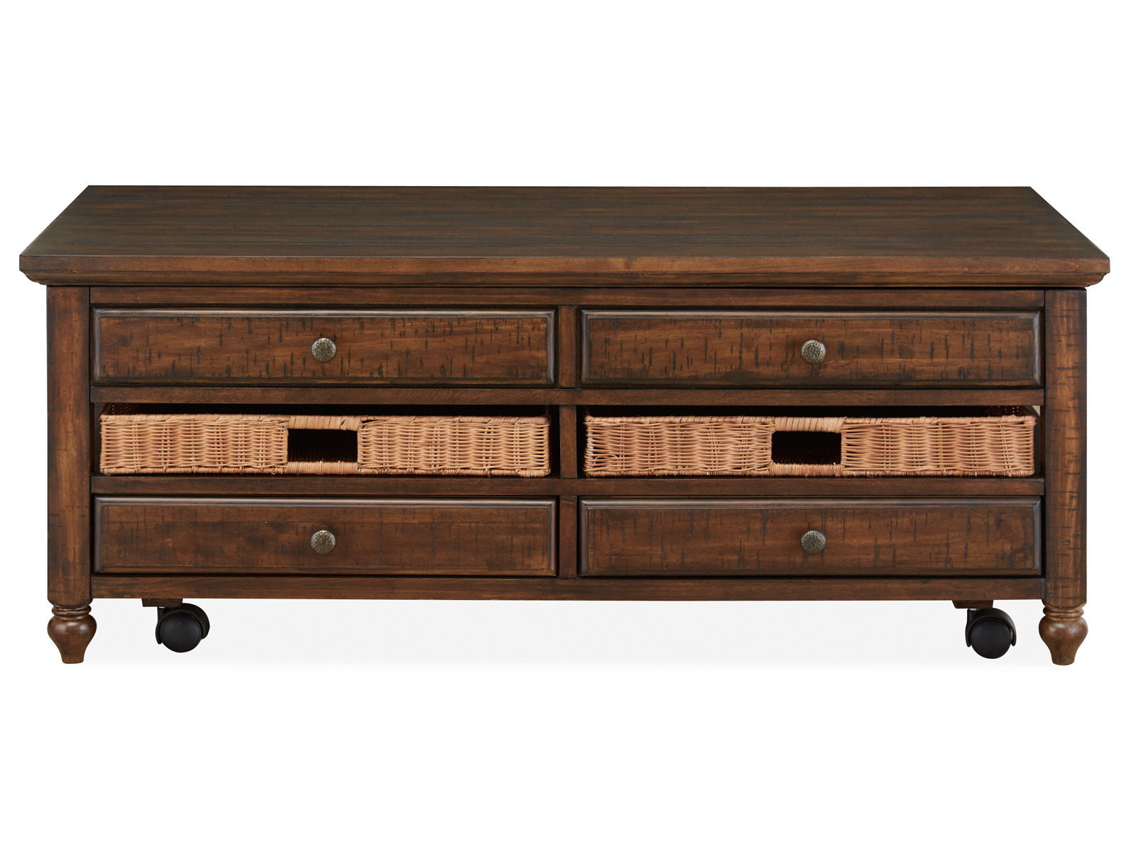 Put your feet up and relax with bungalow style with the Cottage Lane table ensemble. The appealing mix of materials includes pine veneer and solids, rattan baskets, casters, and weathered bronze hardware. Plenty of storage and easy lifestyle appeal welcome in this 4 piece casual collection.
