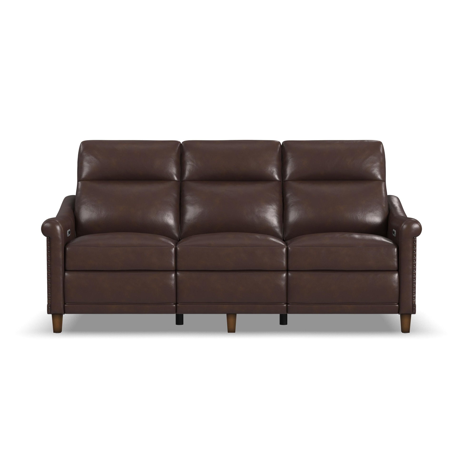 Timeless, traditional details meet today’s modern comfort capabilities with the Elizabeth leather power reclining sofa. Inspired by vintage stationary furniture, this sofa features sloped, petite roll arms, curved side base rails and decorative nailhead trim reminiscent of a bygone era. A high-divide back, extended footrests and powered headrests provide support for complete relaxation. Upholstered in a buttery-soft, durable, brunette brown leather, the Elizabeth sofa exudes elegance and luxury.