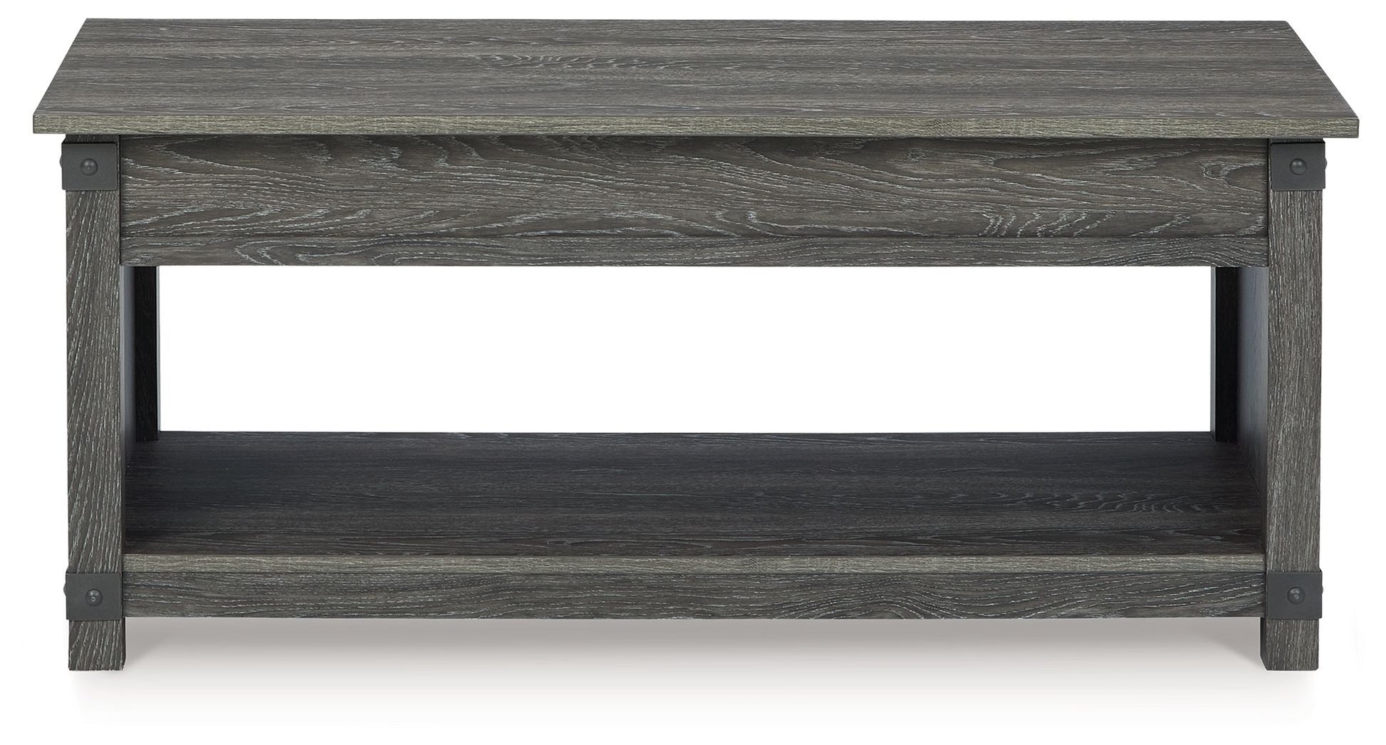 Open the door to modern farmhouse style with this lift-top coffee table. The beautiful woodgrain look and classic crossbuck metal accents are a cool touch, while the lower shelf provides surface space for fashionable home accessories. Sporting a gray replicated wood grain effect, its handy spring-loaded mechanism brings the tabletop closer to you. This versatile table makes it easier than ever to eat, work or play from the comfort of your sofa.