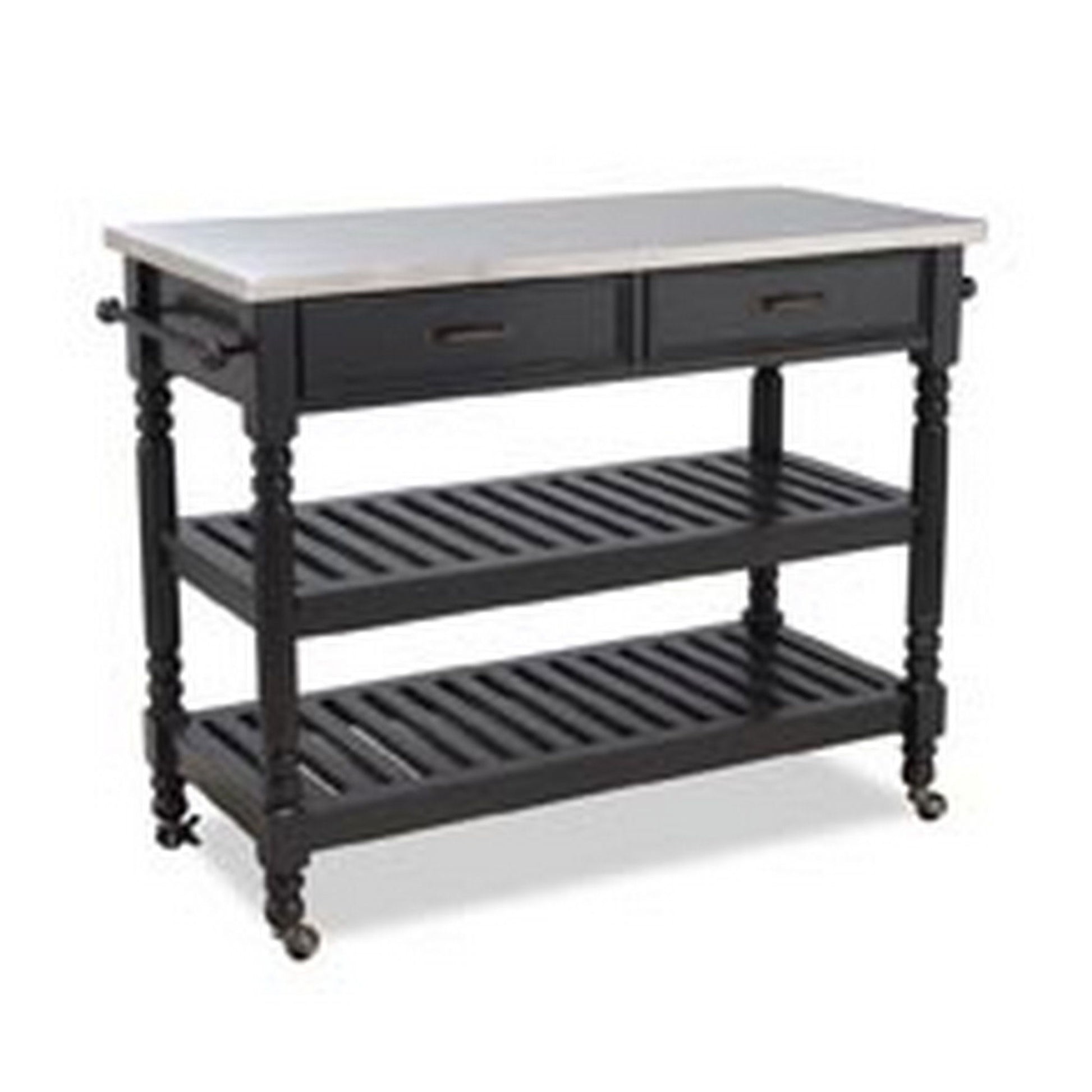 Turn your kitchen into the most magnetic room of the house with this Homestyles General Line Kitchen Cart. Easily roll the prep space wherever it's needed, and bring extra storage and convenience with it. The finish matches any surrounding décor and the drawers and shelves keeps the space tidy. With solid construction, a timeless stainless steel top, and a durable clear coat, it is easy to clean and maintain.
