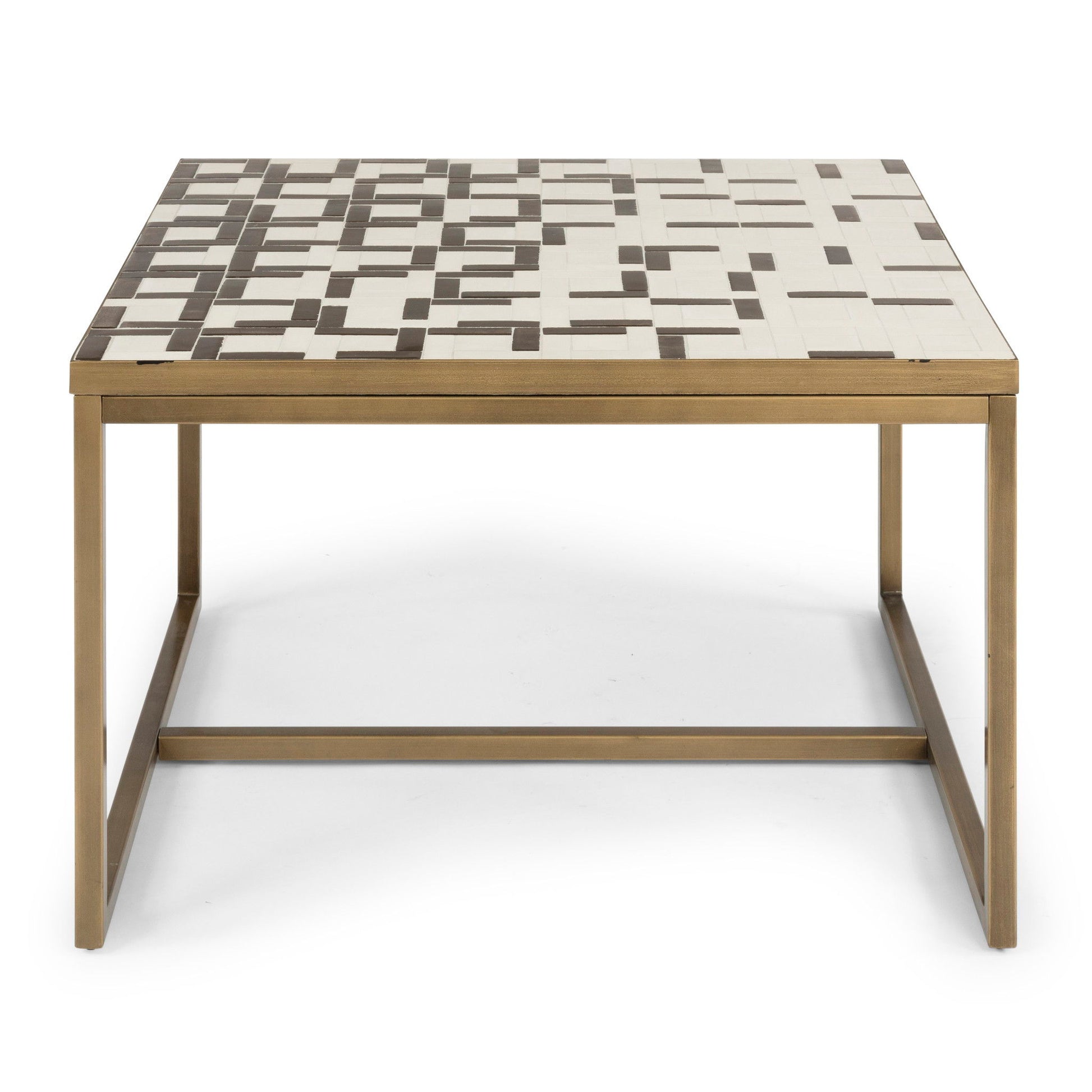ake a new angle on designing your indoor or outdoor spaces with this Geometric Table by homestyles. The table features a contemporary mosaic tile top with open metal base, finished in a brushed-brass, powder-coated paint finish. The top is a hand-applied random pattern of cream and metallic gold tiles. The metal tube frame is supported by a center stretcher, which adds stability to the table. This table can be used both indoors or outdoors. Finish and measurements may vary slightly. Assembly required. Arrives at your door by parcel delivery service.