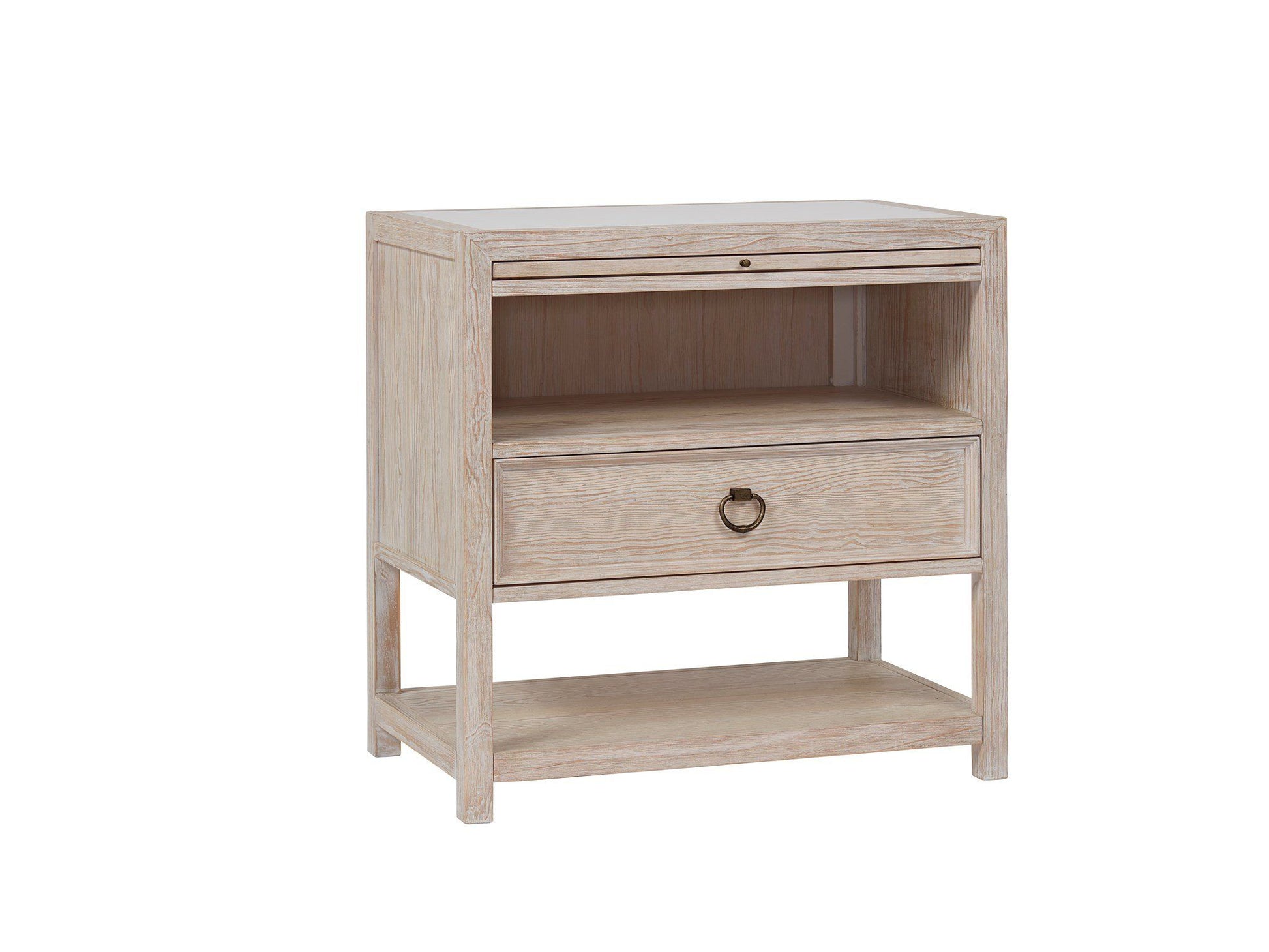 The perfect bedside companion, the Getaway Drawer Nightstand marries the best of function and coastal style with open-air storage, a spacious drawer, smooth stone inset top, pull-out shelf and bronze ring pull hardware