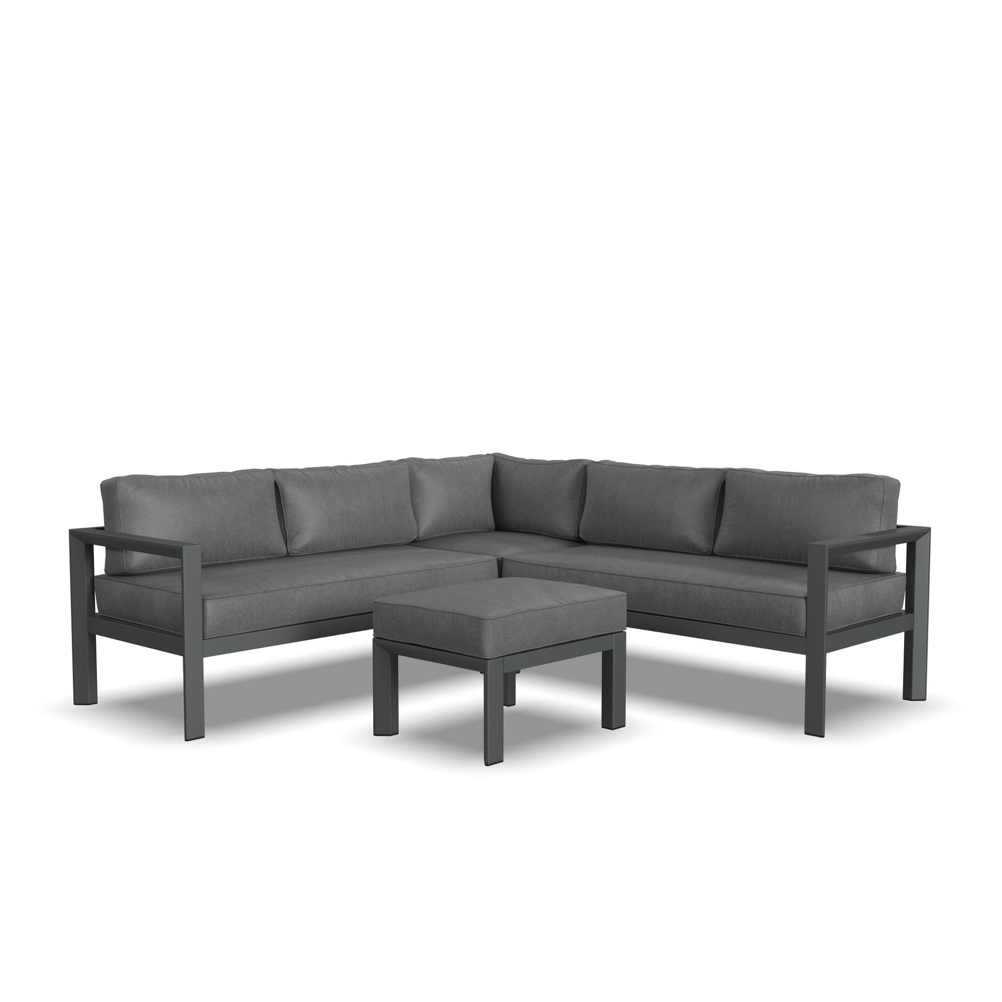 Outdoor spaces become as comfy and cozy as a living room when you add a Homestyles Grayton 5-Seat Outdoor Sectional with Ottoman. With thick seat and back cushions that you can sink into, you can make seating for five or stretch out comfortably with a good book (or, let's be honest, your phone). The recycled aluminum frame with stainless steel hardware and weather-resistant cushions make this a sectional for all seasons, year after year.