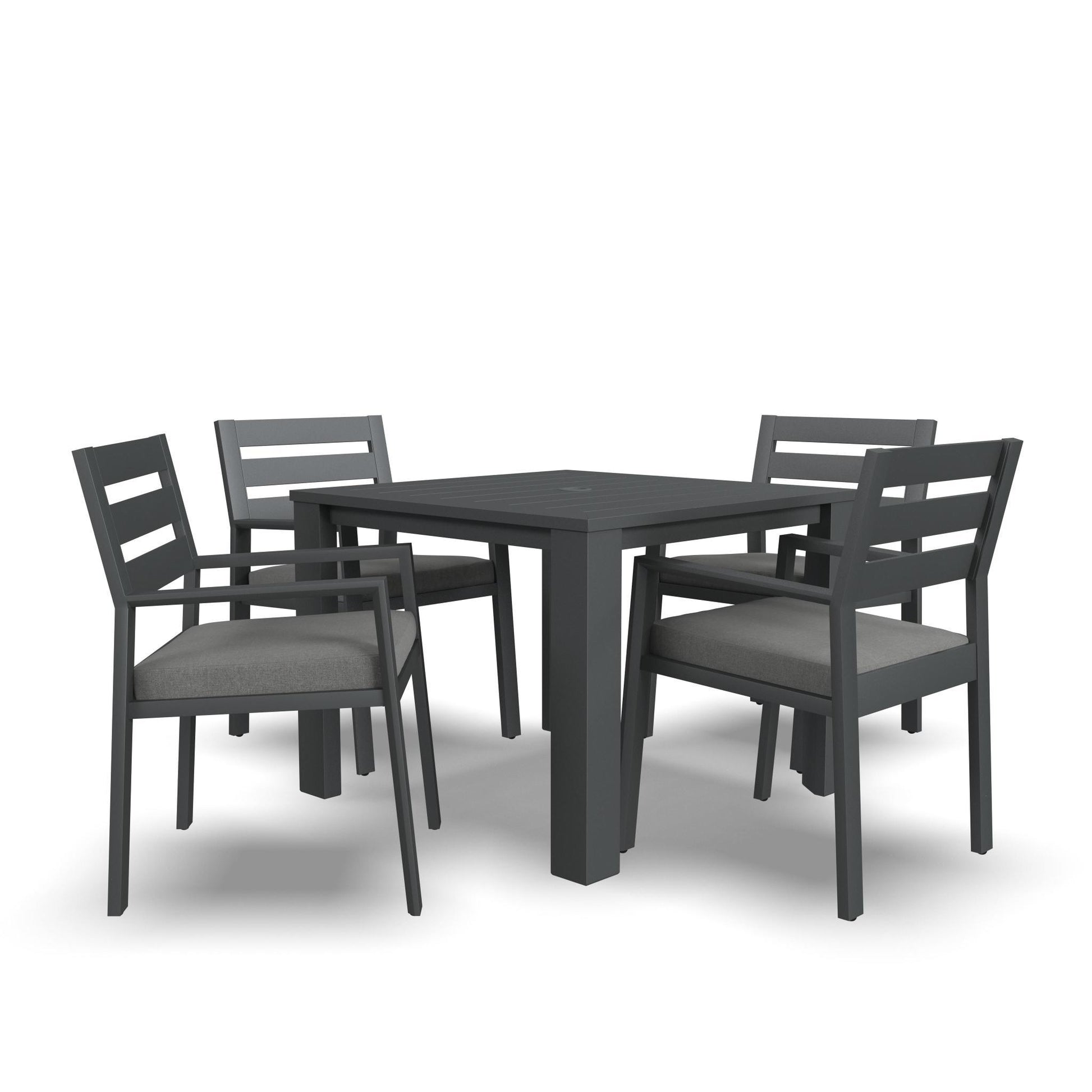 Outdoor spaces become a place to gather and eat when you add a Homestyles Grayton Outdoor Dining Set. This set includes a square dining table and chairs. The slatted table top prevents water from pooling, and the comfy chair cushions provide enjoyable comfort. The durable recycled aluminum frame makes this a dining set for all seasons, year after year.