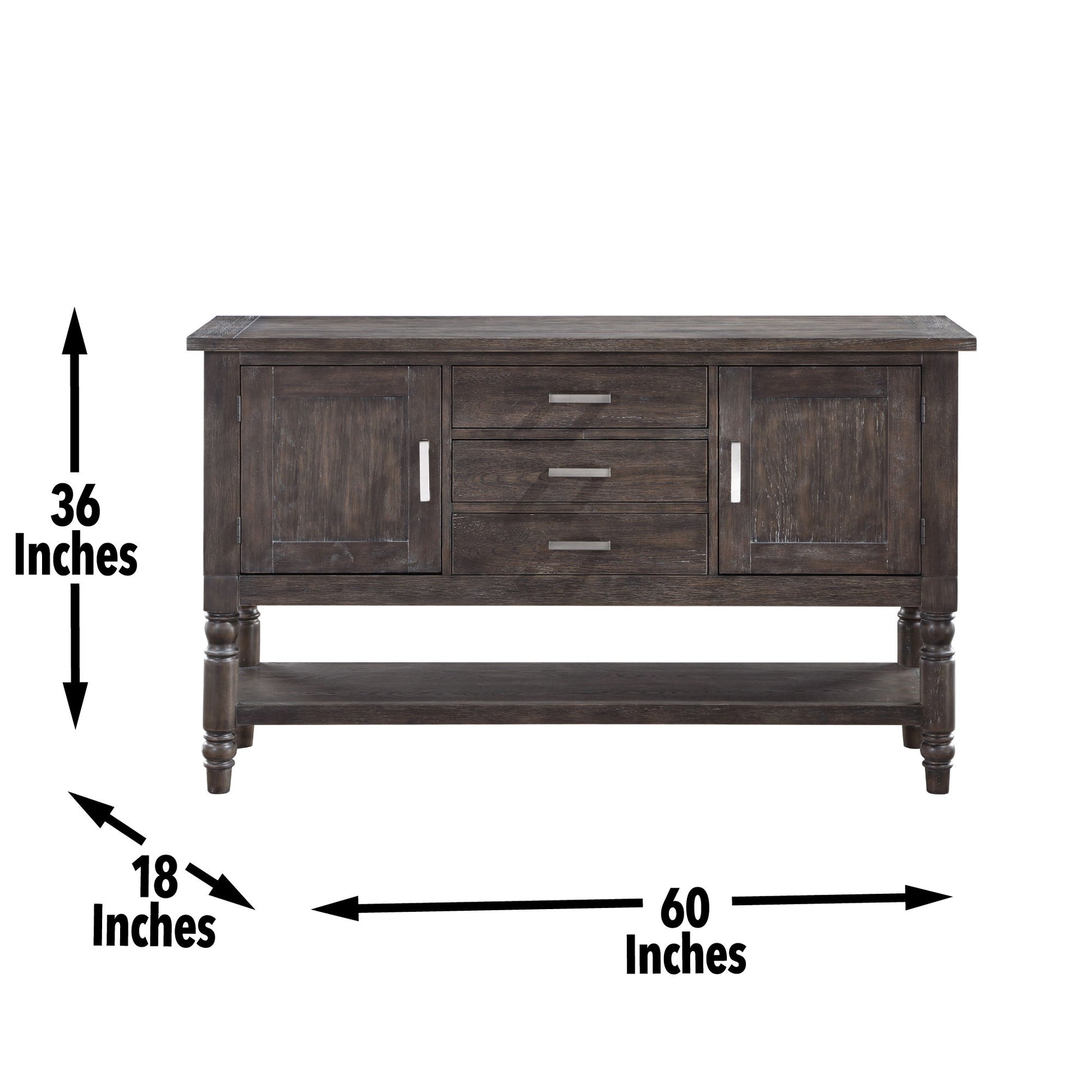 This Server from the Hutchins dining collection adds generous storage and serving area to any dining area. A combination of modern and traditional styling, this piece mixes turned legs with clean lines in an instant classic. Three drawers and two doors add valuable hidden storage and a bottom shelf adds an area for storage or display. This Server, with its dusty charcoal finish and full 60-inch length, will anchor any dining area with elegance and style.