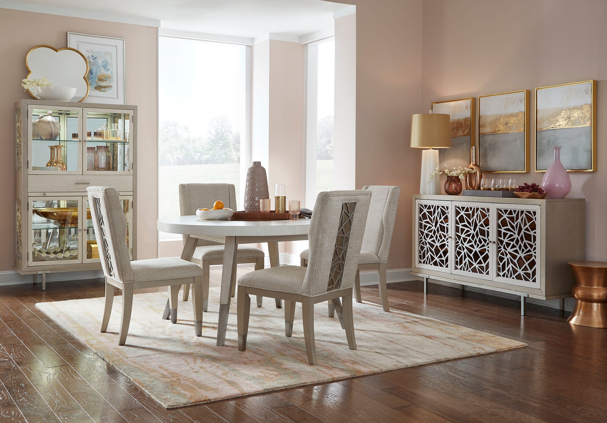 Gracefully-designed with a modern sensibility and the simple contemporary profiles of the Lenox Collection of dining room furnishings come alive with architectural elements and mixed materials including wood and metal and glass and clear mirror. Crafted of Random Width Cathedral White Oak Veneer and Hardwood Solids and Lenox combines the soft Acadia White finish with Warm Silver metal accents and Bronze Glass for a refined and romantic elegant glam. A signature geometric fretwork in the Warm Silver finish appears on the dining chair backs and giving a designer flair to the collection. Metal ferrule caps in the warm silver finish on the dining table and chair and bench legs are a sophisticated touch and complement the Silver Mist hardware. Bring grace and glamour to your home with the Lenox Collection.