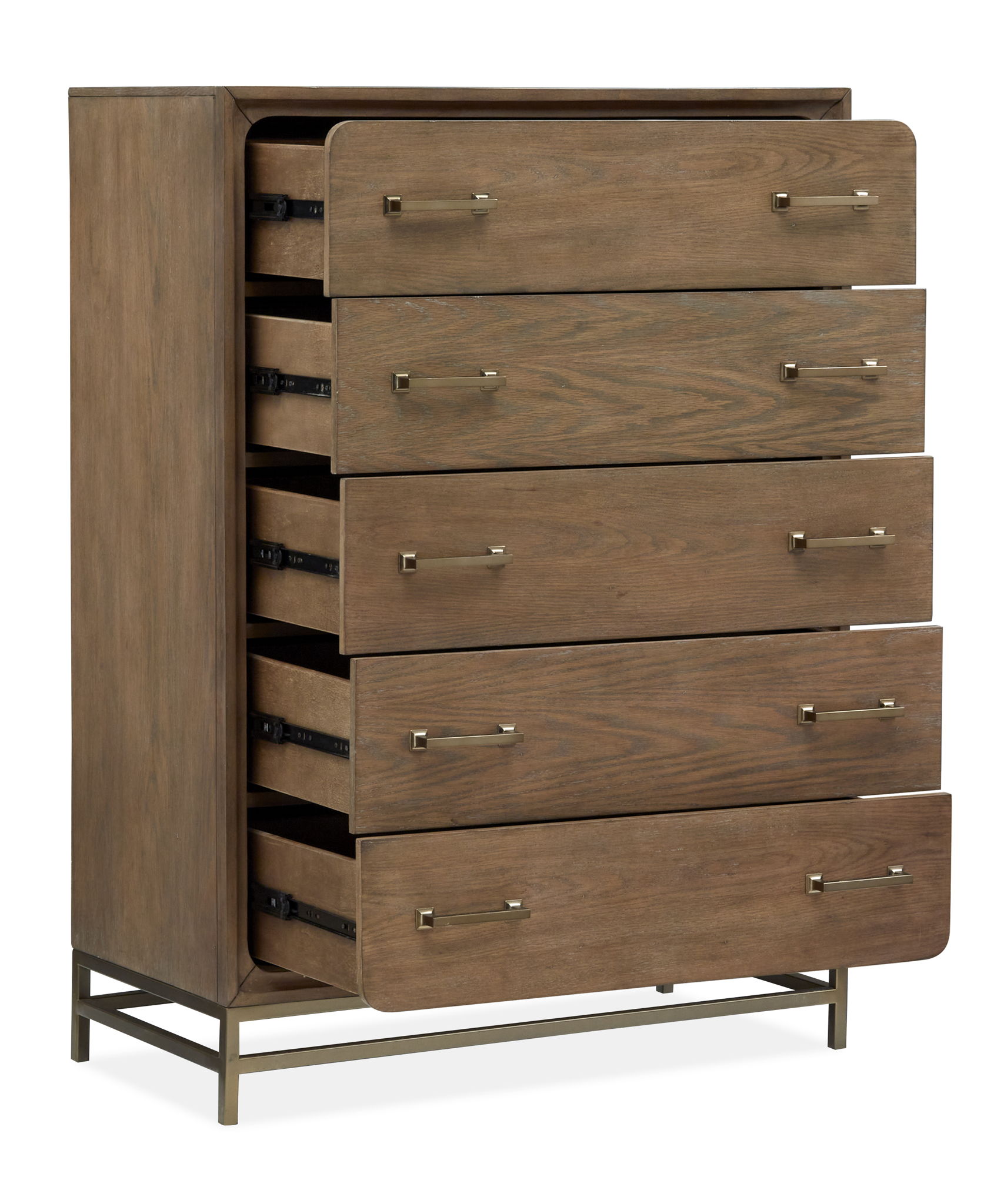With its sophisticated, squared silhouettes and modern lines, Lindon is nothing short of iconic. A Lindon bed makes a bold design statement in any bedroom while creating an undeniable focal point. Dress it up or down, traditional or modern - its beauty has no limits. The coordinating casegoods in this group convey Lindon's streamlined personality while design details such as open metal bases tie all the pieces together. Alluring finishes of Belgian Wheat and Coffee Bean highlight the group's random Cathedral/ Quartered Knotty White Oak veneers and hardwood solids. Burnished Brass hardware adds a finishing touch to this expressive bedroom collection.