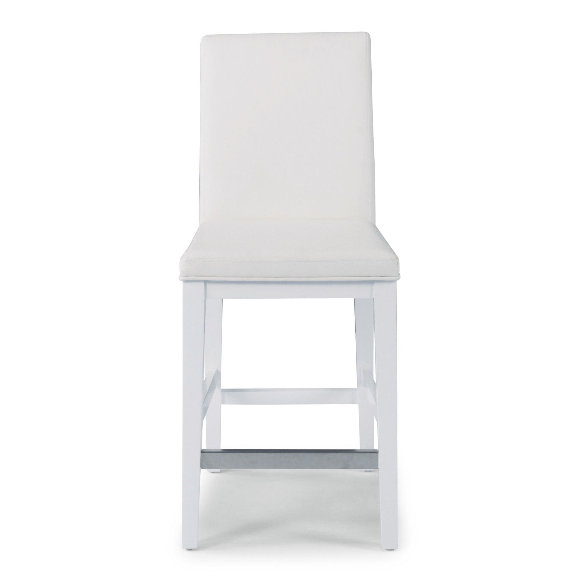 Contemporary European design, with white vinyl padded upholstered seat and back. Solid hardwood frame finished in high gloss white lacquer painted finish. Front rail features brushed metal finished cover for support and protection. Note finish and measurements may vary slightly, assembly required.