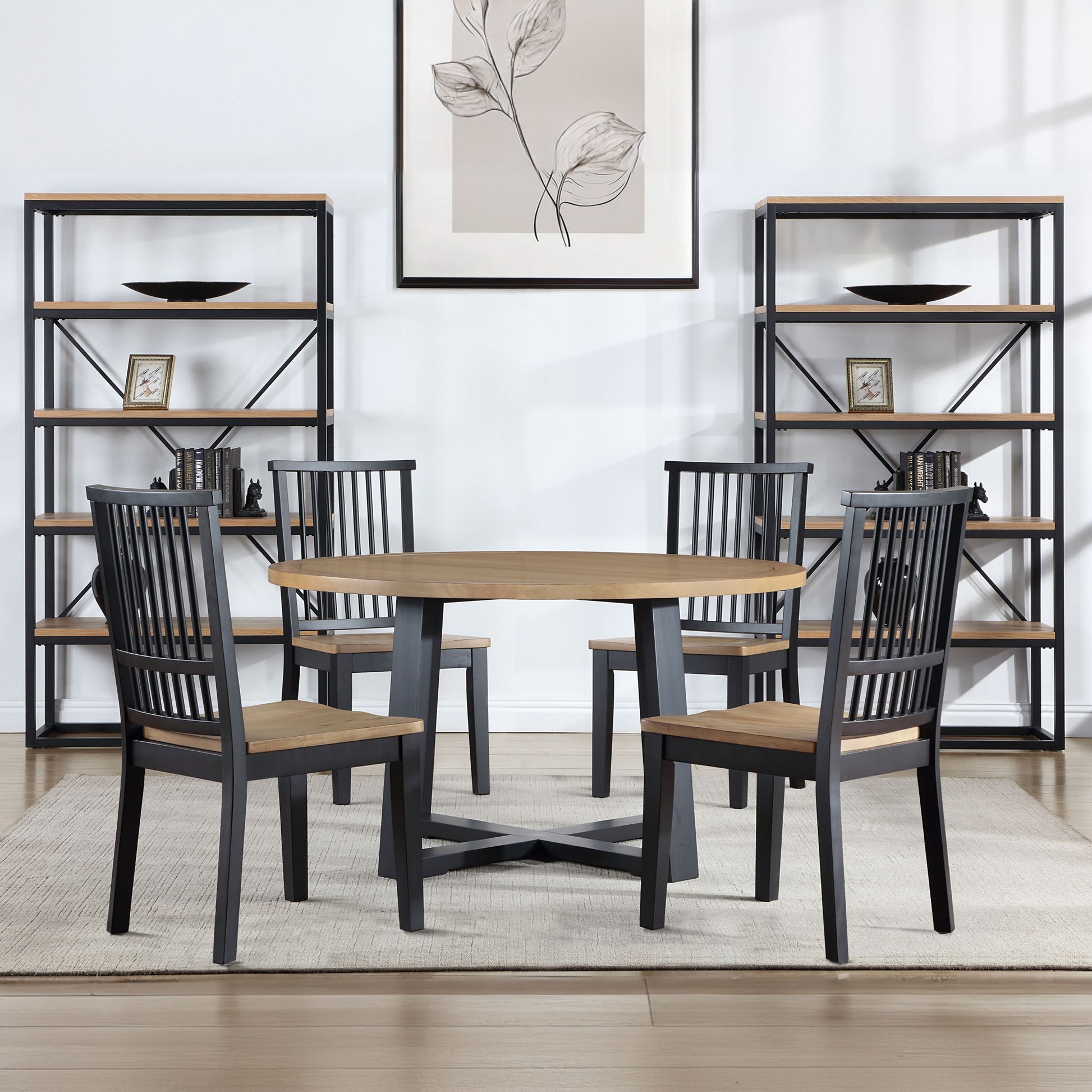 Paired with four Magnolia Solid Wood Side Chairs, showcasing ebony-finished spindle backs and natural wood seats, this set is both stylish and sturdy. Built with durable construction, it adds timeless sophistication to any dining or living space.