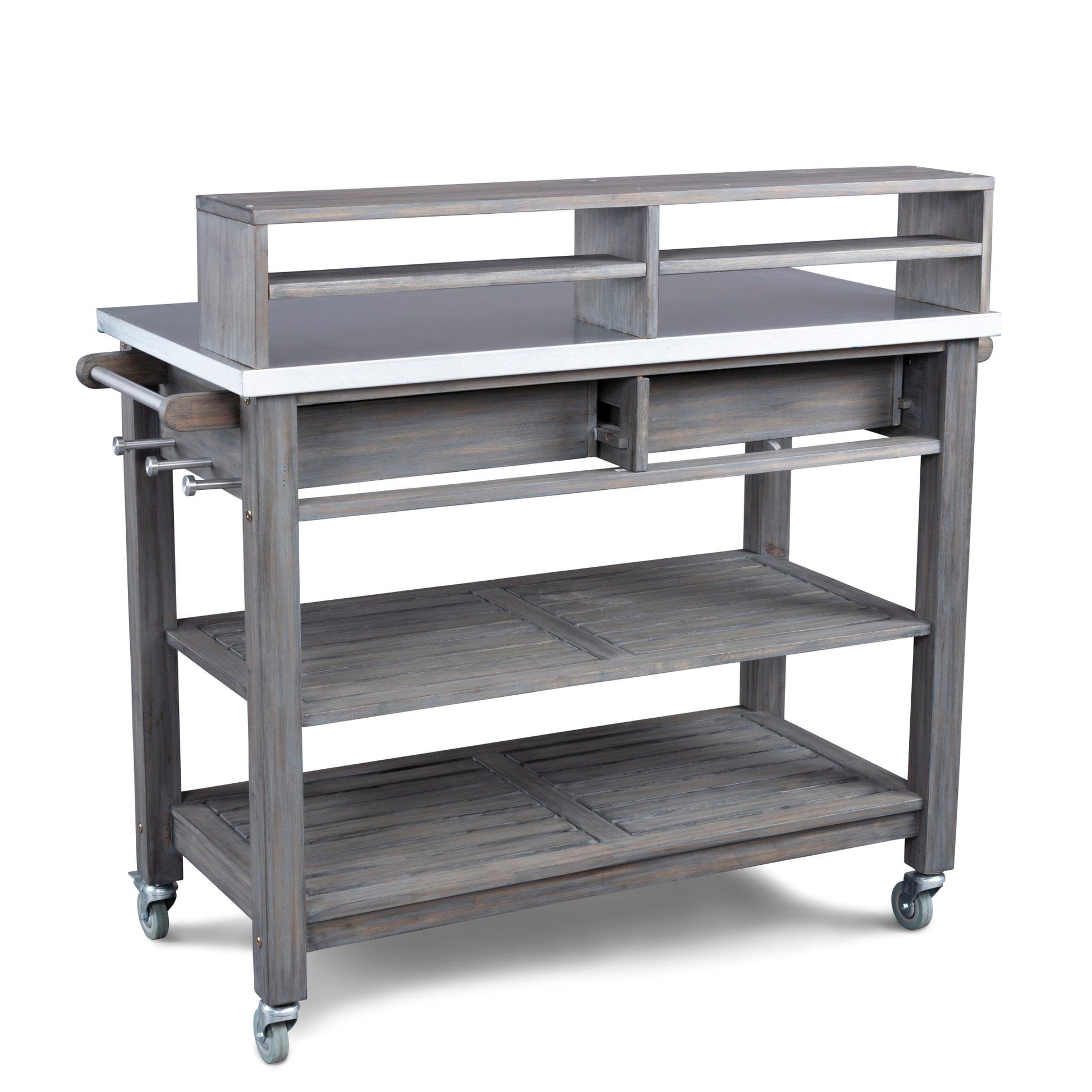 The solid acacia frame is highlighted by a teak finish and sealed with linseed oil that brings out the natural beauty of the wood. The galvanized steel top is rust-resistant, two drawers, two shelves and an upper hutch are convenient places to stow gloves and garden tools.