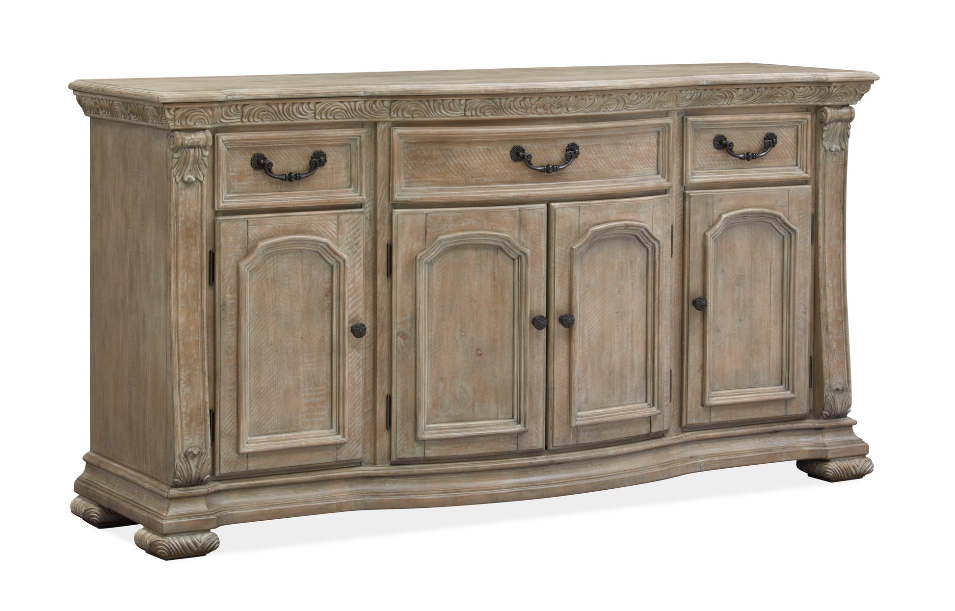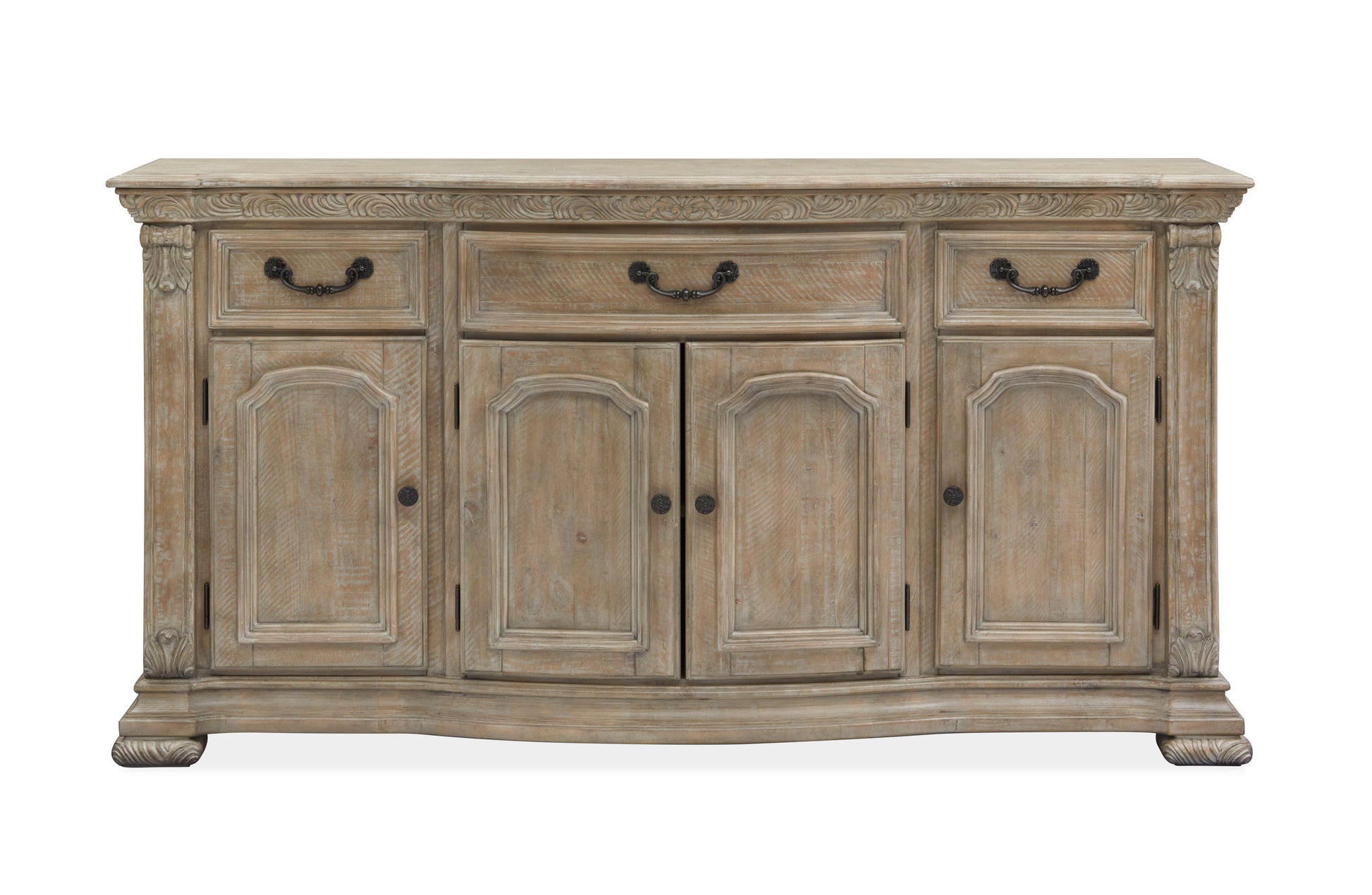 Rooted in Old World design with an updated and relaxed soft Fawn finish, it's hard to surpass the appeal of the elegant Marisol dining collection. Reminiscent of garden gates, a recurring design element is metal fretwork in a graphite finish on case doors and scrolled metal decoration on the hutch, dining curio and the pedestal base of the 65-inch round dining table. Crafted of Pine Solids, timeless and gracious style elements include fluted pilasters, intricate carvings, a shaped foot and dramatic arch shapes on the curio, hutch and huntboard. Three stunning dining case pieces are offered including a buffet curio, buffet with hutch and a huntboard top featuring diagonal planking behind the 3 wood shelves with plate grooves. The three dining tables include a rectangular table, trestle table with a bottom metal stretcher with rosette decorations and the 56-in round table with metal scrolls on the pedestal base. Dining side chairs include two upholstered-seat chairs, one with a wood fretwork back and one with an upholstered back. Beautifully-scaled host chairs in a classic upholstered wing style are offered with a leg or skirt option. Elevate your interiors with the refined style of Marisol.