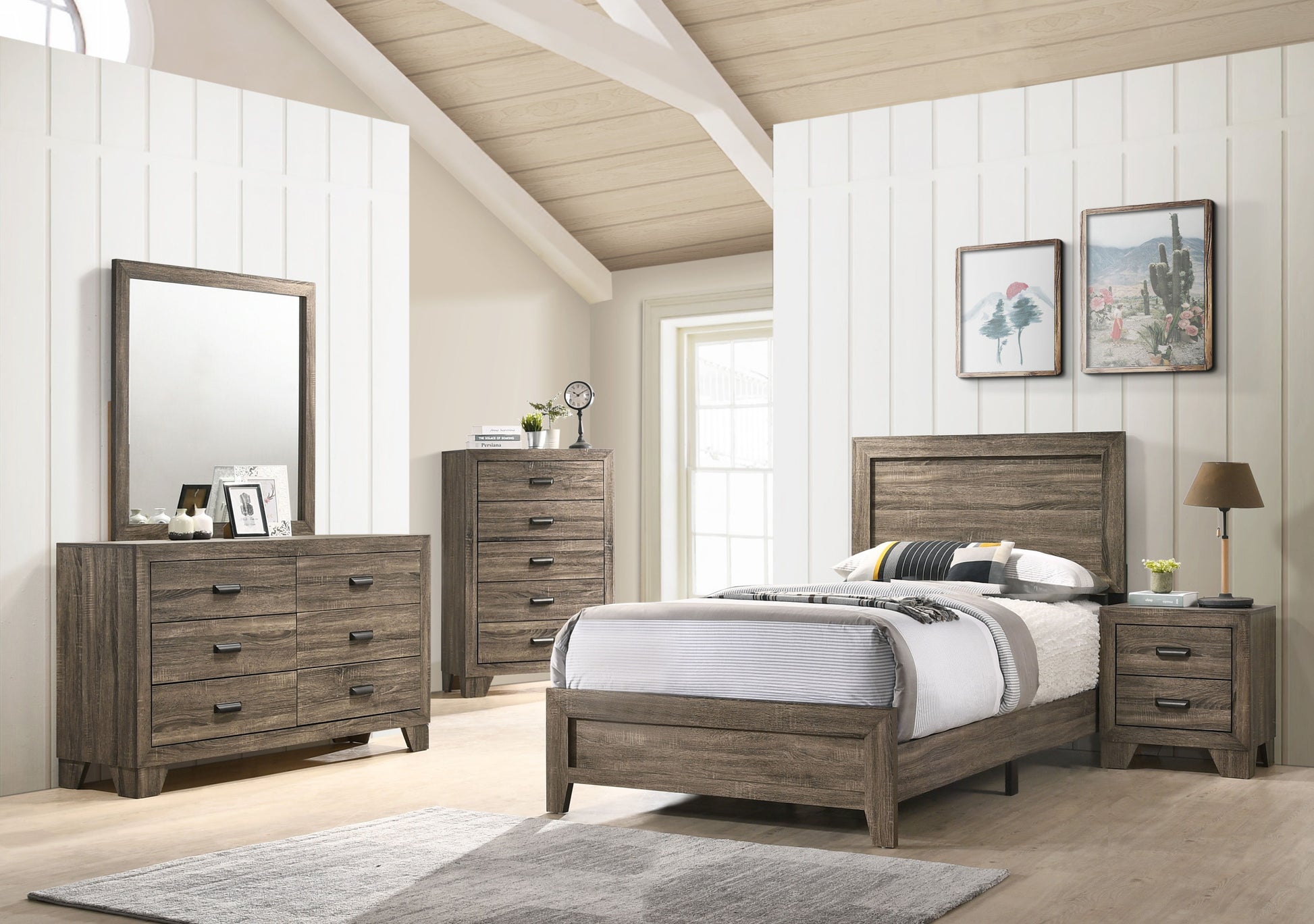 This bedroom set offers a minimalist design with a nod to rustic aesthetics, perfect for creating a serene and uncluttered space. The straightforward lines of the bed frame, combined with the wood finish, exude a sense of calm and earthiness. The accompanying pieces, including a simple dresser with a matching mirror, a functional chest, and a streamlined nightstand, are all characterized by their clean profiles and understated hardware. This collection is designed for practicality and durability, with ample storage options that cater to a hassle-free, organized lifestyle.