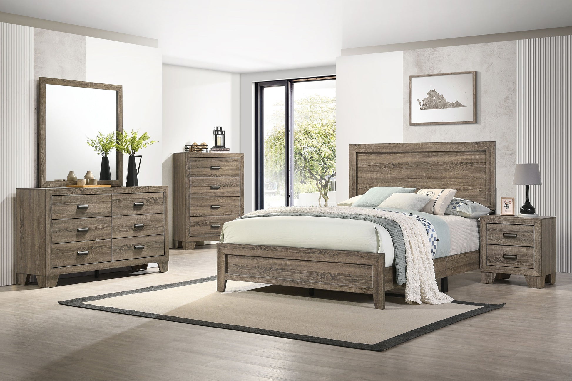 This bedroom set offers a minimalist design with a nod to rustic aesthetics, perfect for creating a serene and uncluttered space. The straightforward lines of the bed frame, combined with the rich wood finish, exude a sense of calm and earthiness. The accompanying pieces, including a simple dresser with a matching mirror, a functional chest, and a streamlined nightstand, are all characterized by their clean profiles and understated hardware. This collection is designed for practicality and durability, with ample storage options that cater to a hassle-free, organized lifestyle.