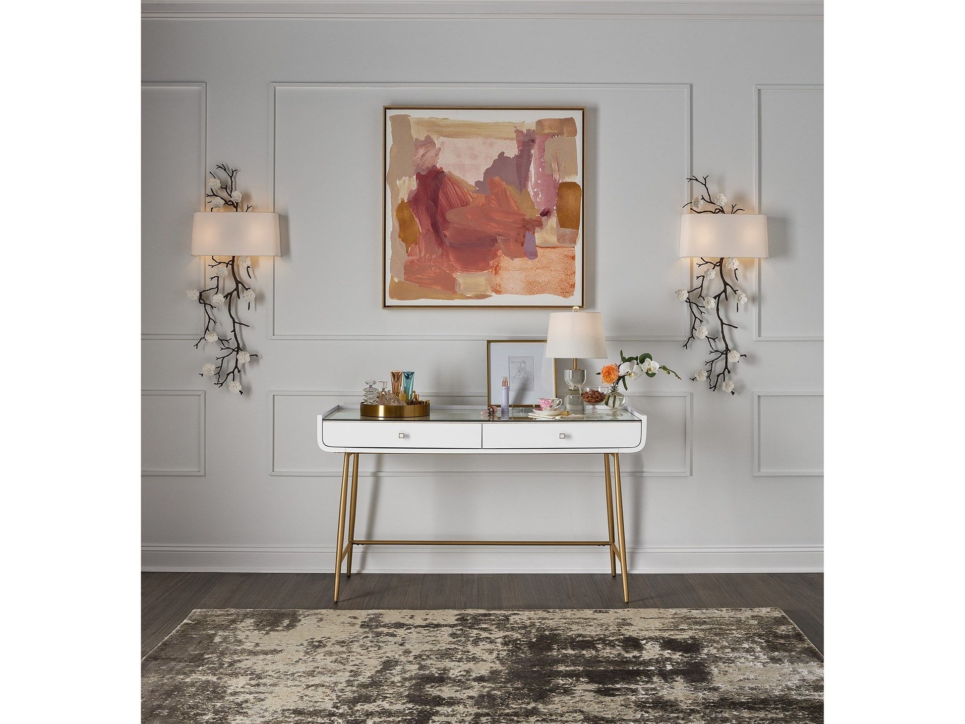 Perfectly suited for a bedroom, home office, and more, the Allure Vanity Desk was designed with every detail in mind. Featuring a glass tabletop inset with faux leather underneath, two drawers with mother of pearl hardware, a soft gold metal base, and a white lacquer finish, this desk embodies refinement.