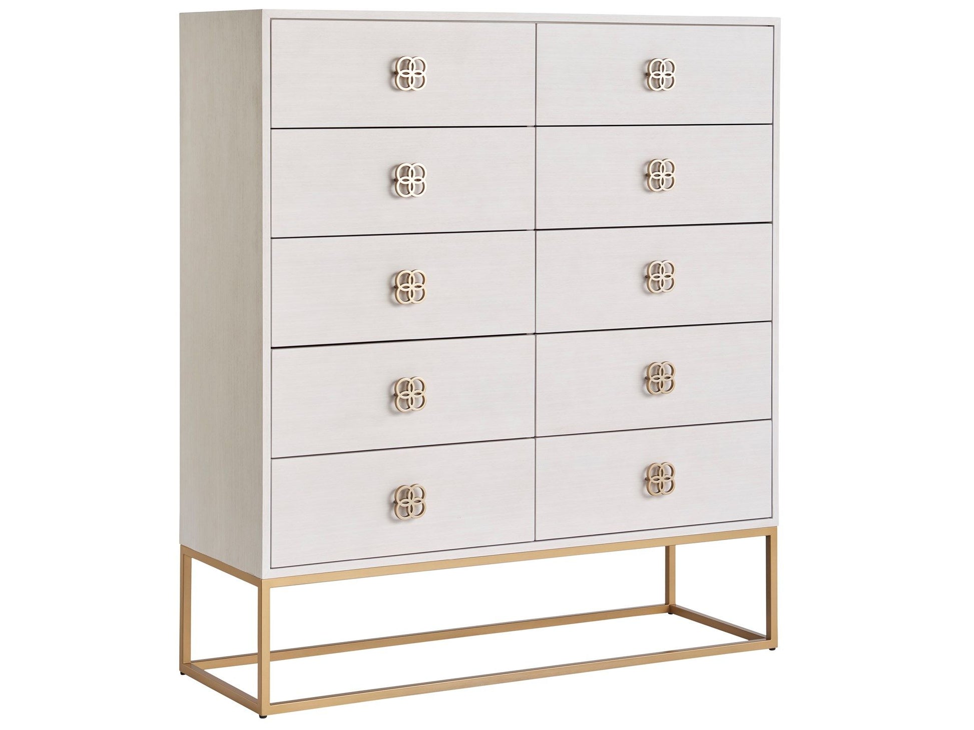 Exquisite and poised, the Peony Drawer Chest is crafted with ten spacious drawers that are accented with butterfly-inspired champagne hardware and encased in a fresh Alabaster finish. A soft gold metal base completes this playful yet elegant storage piece.