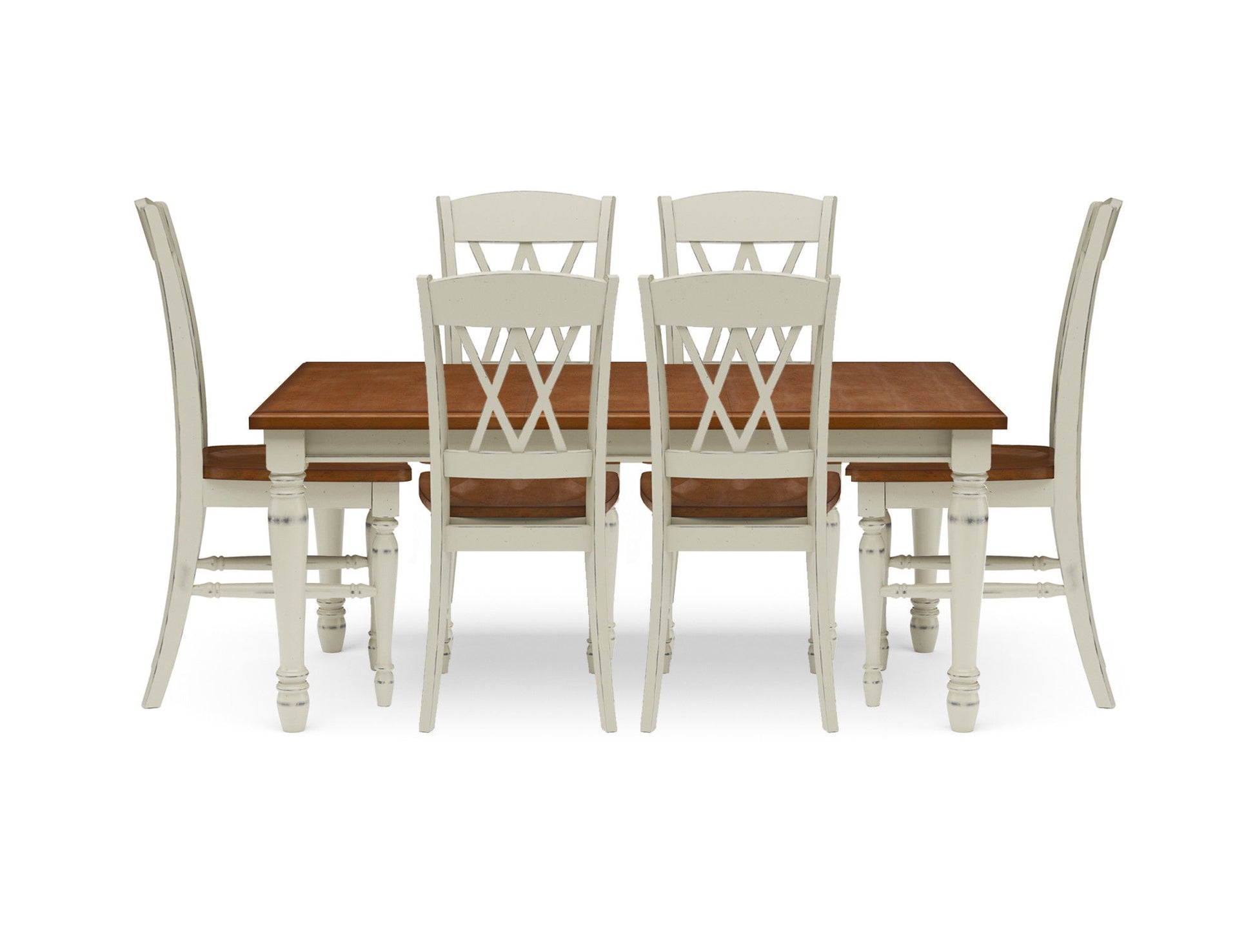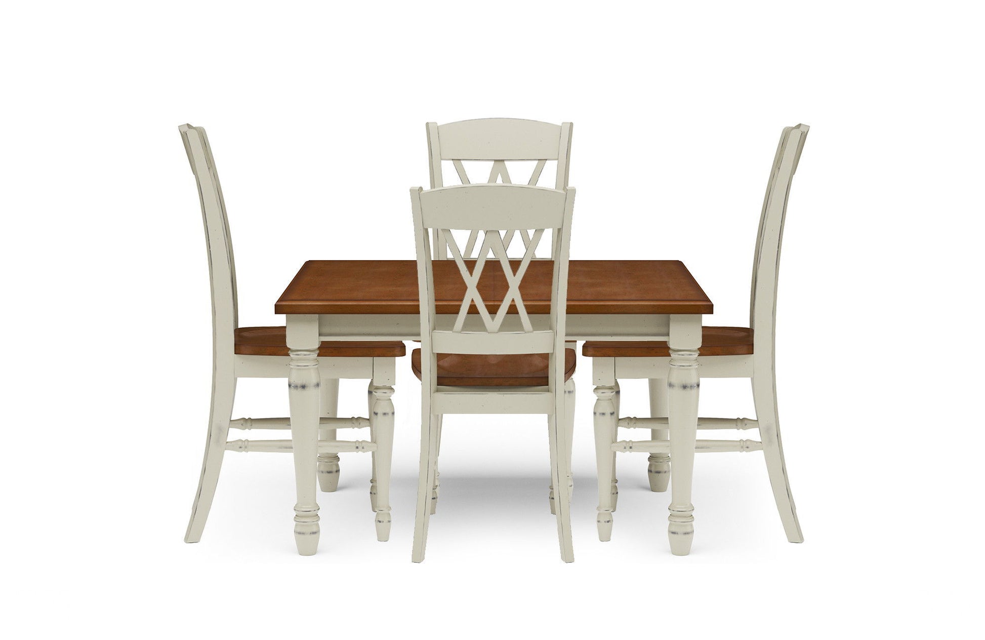 The Monarch Rectangular Dining Table and Four Double X-back Chairs by homestyles blends upscale design with functionality. This stylish dining set blends hardwood solids, engineered wood, and veneers with a rubbed off-white, nine-step distressed oak finish. This set projects striking style with sophisticated, solid wood turned legs with intricate carved detail.