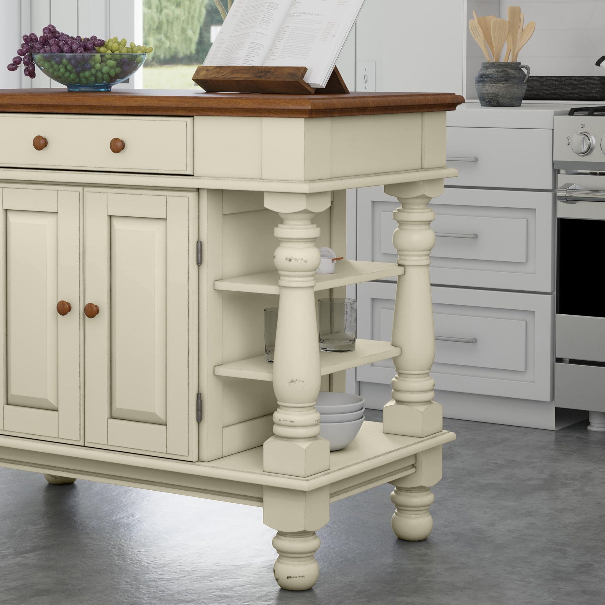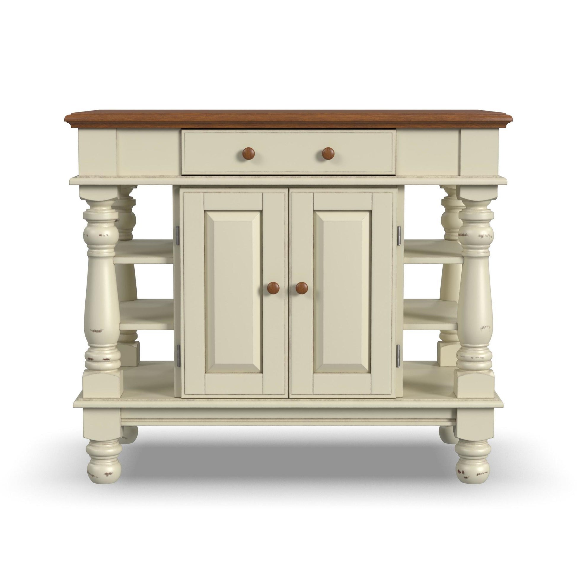 Add a stylish way to make the most of your kitchen storage space with this Homestyles Americana Kitchen Island. The hardwood top sits one a durable engineered wood frame, which features antique brass hardware. Loaded with open and closed storage options, it combines modern conveniences with a classic aesthetic.