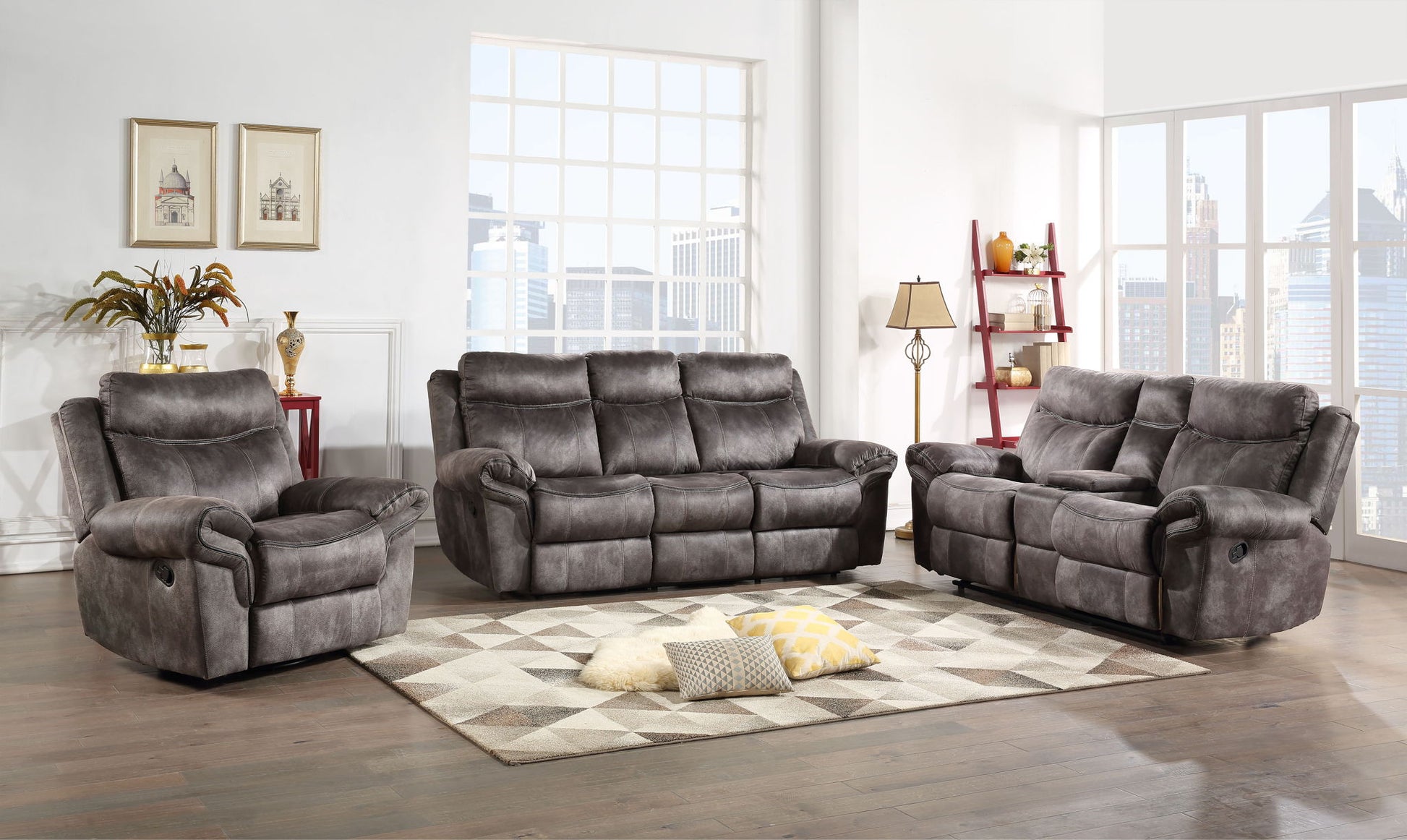 The Nashville Reclining Set offers incredible comfort and style in a manual reclining package. The Recliner and Console Loveseat both feature Glider sets that have a comforting gliding motion to add to the convenience of the reclining function. The Console in the Loveseat add valuable storage to any room while the Sofa's Drop-Down Console offers a full work or play station with work surface, USB recharging ports and electrical outlets. The faux-suede cover on all pieces complements any room with its neutral grey cover. Generous arms in an overlapping design add ample padding to complement the lavish seat cushioning for a relaxing reclining experience.