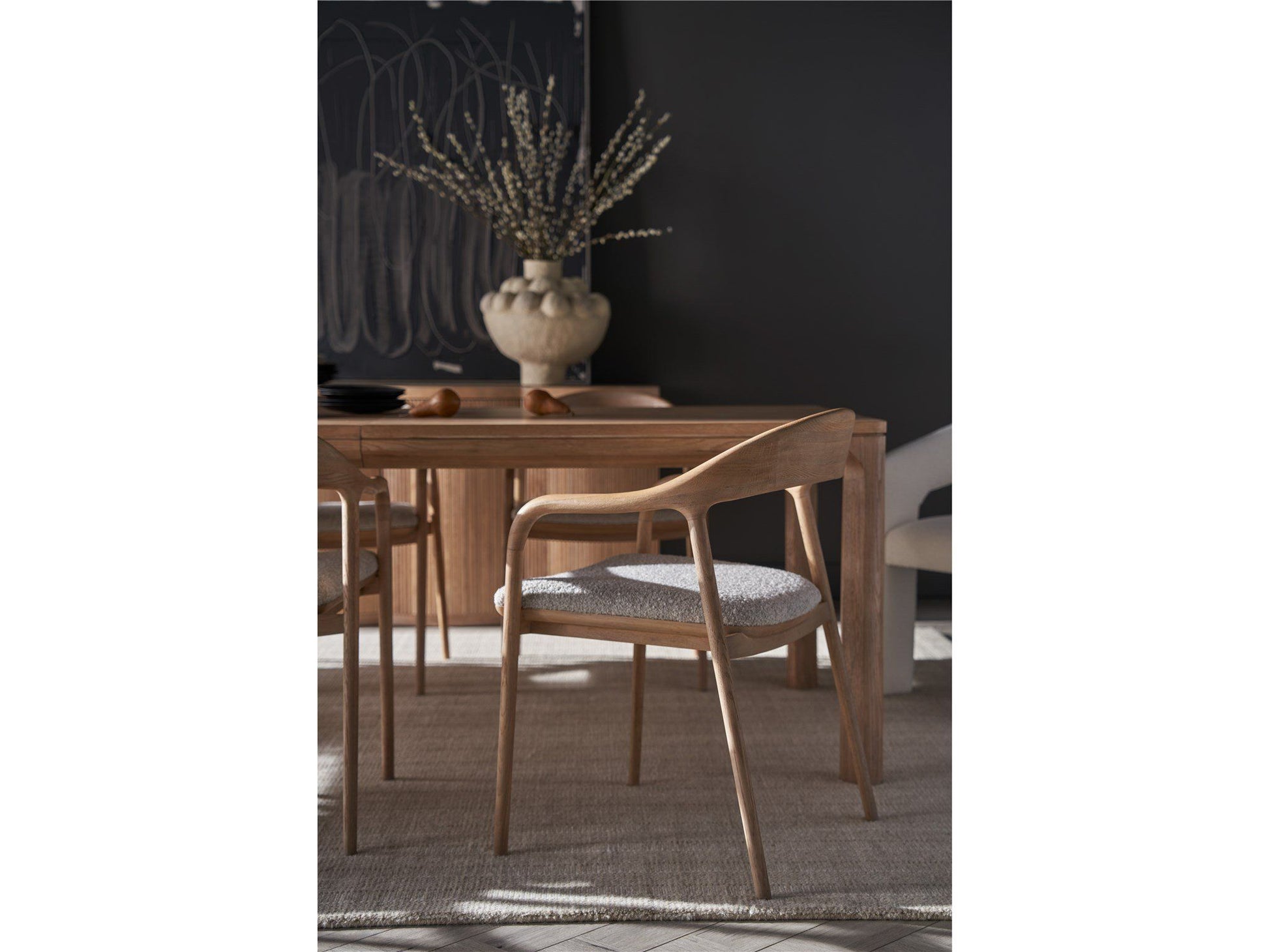 The Echo Dining Arm Chair, available in several finishes and upholstered in the refined fabric, encapsulates elegance with its rounded, open-air back design. Its lithe, straight legs and gently curved back exude a sleek, streamlined form, imparting an aura of sophisticated airiness to the modern dining ensemble.