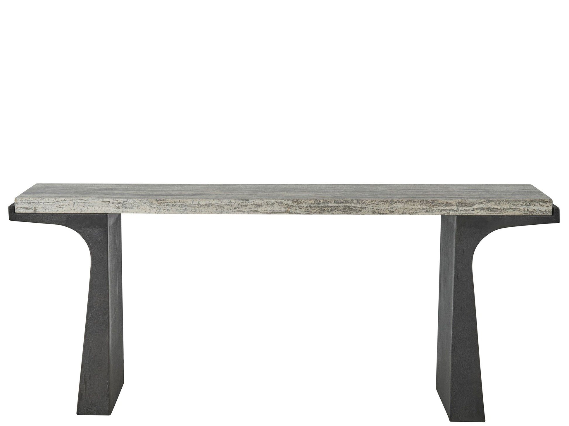 The Quill Console Table presents a sleek, abstract expression in design, featuring a White Travertine top elegantly perched on a pedestal of Aluminum with a Dark Bronze finish. This piece introduces a touch of matte texture and intrigue, effortlessly enhancing spaces with its unique aesthetic and refined presence.