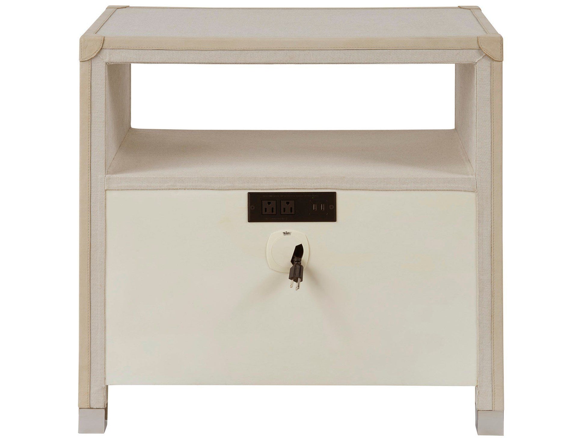 The Riven Nightstand showcases an imaginative blend of modern textures, featuring two drawers adorned with polished nickel ring pulls. Its body is elegantly wrapped in fabric, complemented by light gray leather edging, creating a sophisticated contrast. An open-air shelf adds functionality, providing a space for display or storage, and enhancing the nightstand's contemporary appeal.
