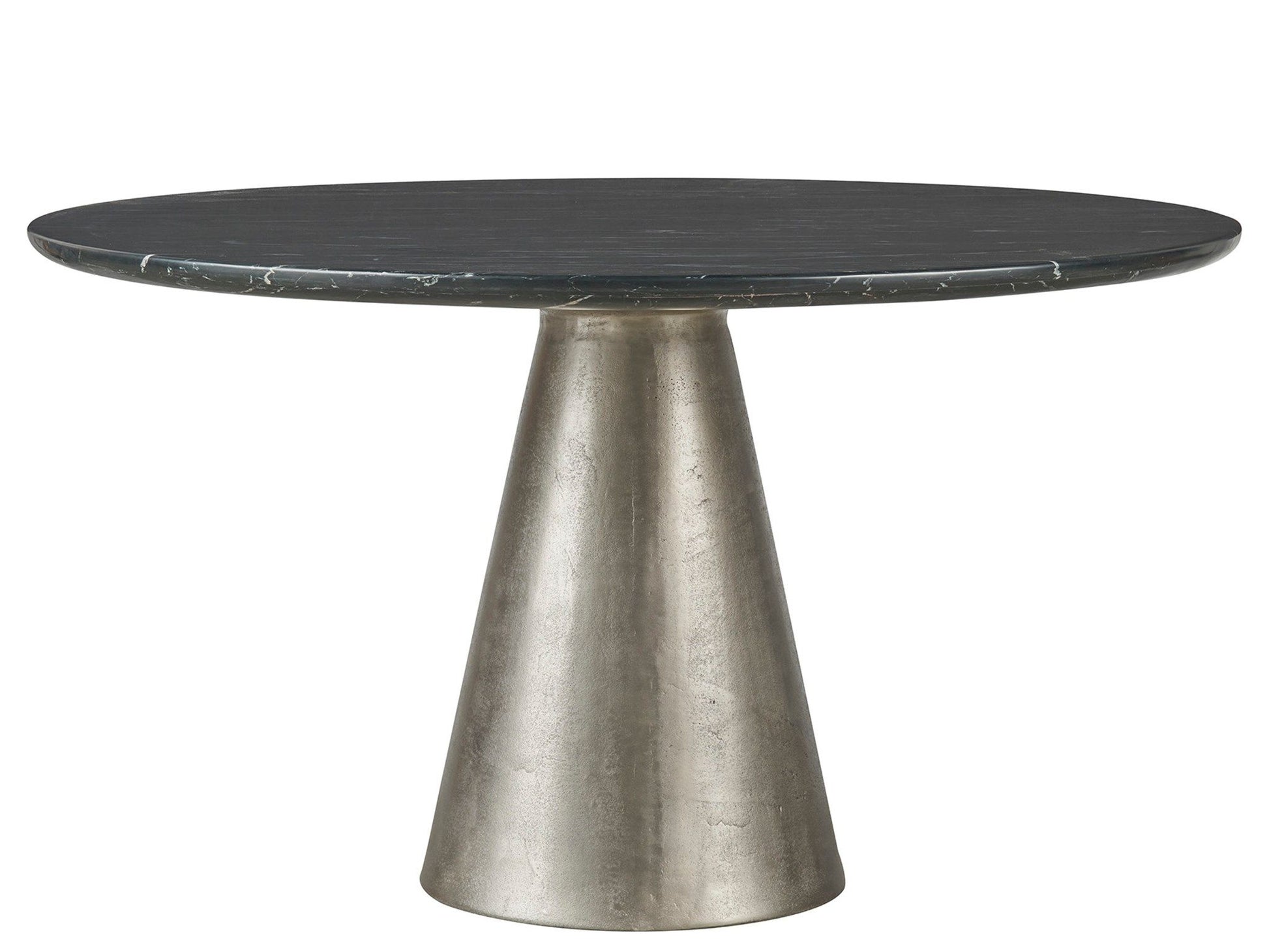The Slate Dining Table captivates with its imaginative design, marrying the sleekness of a Black Merino stone top with the geometric intrigue of a pyramid-shaped base in Antique Silver cast aluminum. This combination creates a piece that is not only visually striking but also carries a hint of glamour, making it a standout, reflective centerpiece in any dining setting.