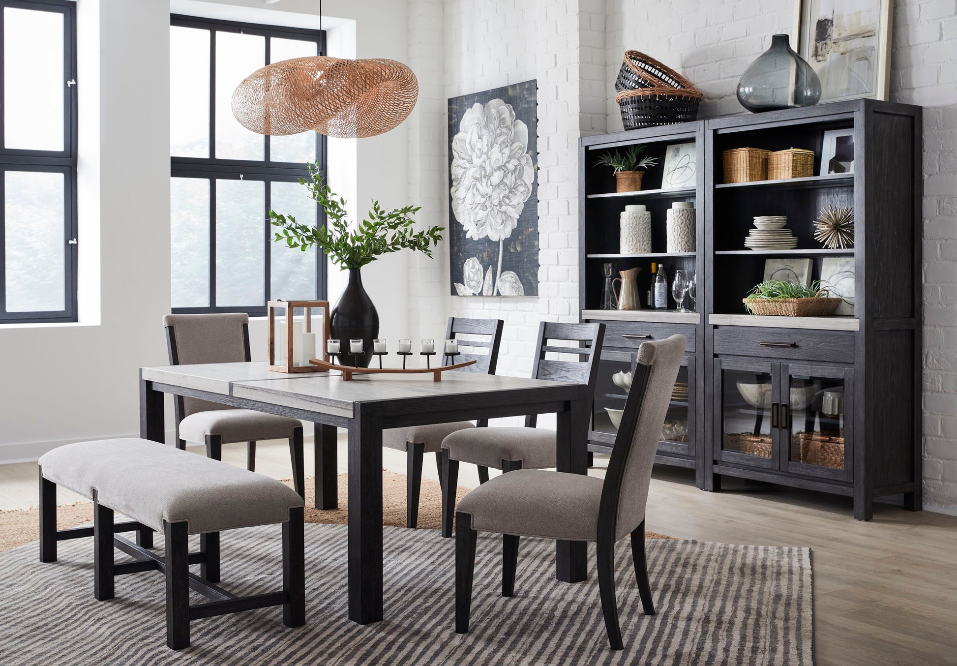 The Plum Creek Collection brings a serene and seasonless style to your dining room and combining natural beauty with subtle sophistication. Finished in a soft Ravenwood Black and complemented by Oil Rubbed Bronze hardware and the collection blends Random Cathedral and Slip/Flip White Oak Veneer and hardwood solids and stone and and fabric for a warm and inviting look. The feature smooth lines and gentle curves and while the notched stone detailing adds an element of texture and interest. The Plum Creek Collection brings timeless charm to any home and offering a perfect balance of understated elegance and effortless warmth.