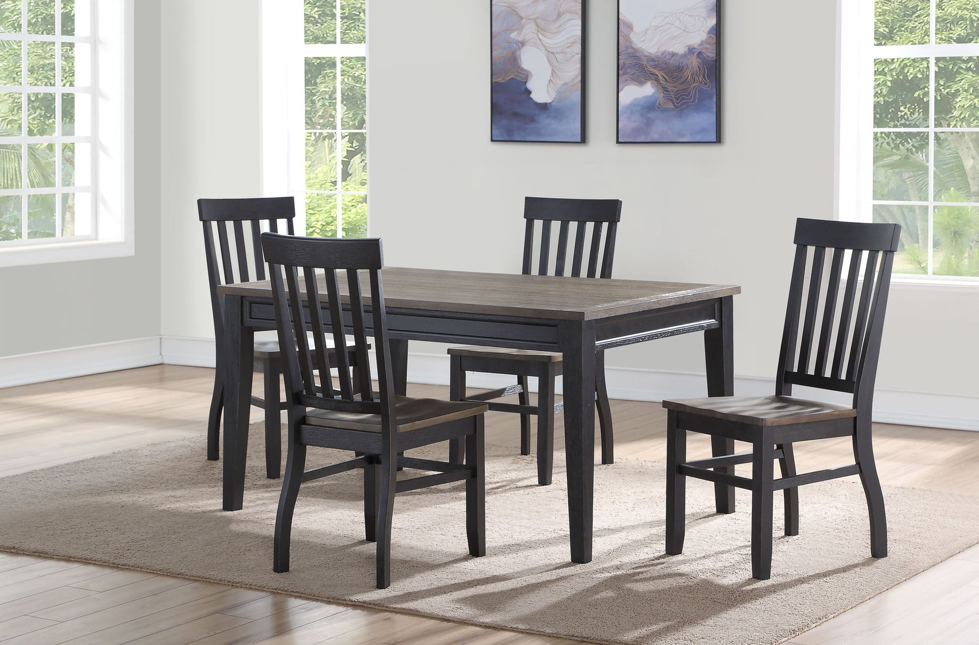 The Raven Dining Set features farmhouse styling with an updated look combining clean lines with a two-tone finish. The Raven dining table exhibits cottage style with it's plank effect top with breadbox veneer pattern, picture frame table apron and sturdy tapered legs. The Raven Side Chairs with schoolhouse styling feature a scoop seat for comfort and stretchers with a tapered leg for strength and support. Your purchase includes one dining table and four dining side chairs.