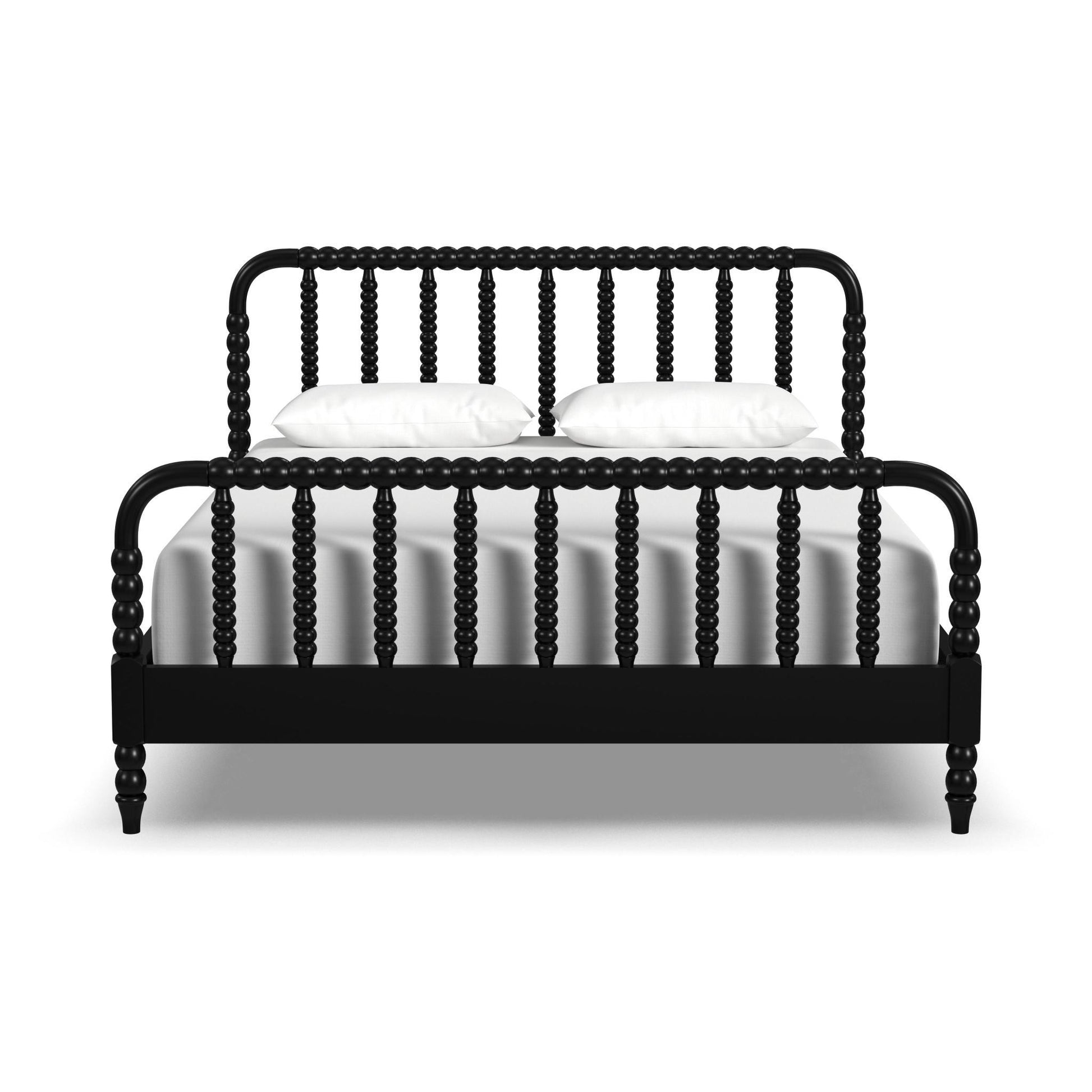 Add some ornate flair to a master suite or guest bedroom with the Spindle Bed from Homestyles. Carefully crafted from solid mahogany wood and veneers, this bed features a sleek black finish that pairs well with any aesthetic or color palette. Its slatted headboard and footboard showcases an arched silhouette with elaborately turned accents, making it a statement in the room.