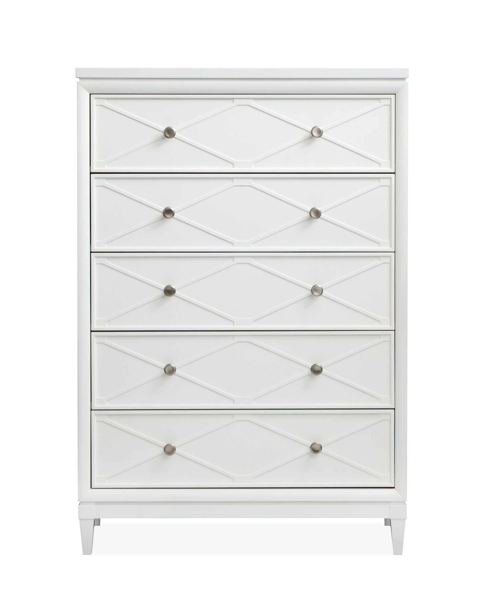 The Springhouse Collection is a refreshing take on cottage and coastal and and modern farmhouse design and featuring a clean Whisper White finish and refined Satin Nickel hardware. Its casegoods are thoughtfully crafted with decorative X molding details that add visual charm and while the small-scale nightstands are perfectly sized for second bedrooms or cozy spaces. The upholstered bed options provide a soft and inviting centerpiece and complementing the feminine touch of the delicate knobs. This collection offers a light and airy aesthetic that effortlessly enhances your bedroom and creating a serene and stylish retreat for your home.