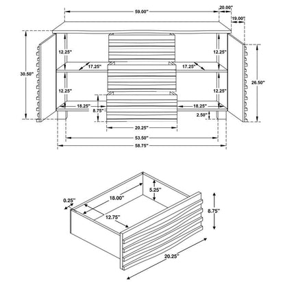 This sideboard showcases bold modern styling with a striking wave-front design across its drawers and doors. A sleek rectangular silhouette finished in rich black enhances its artistic profile while providing versatile storage. Crafted from solid rubberwood, engineered wood, and oak veneer, it balances strength and elegance. With spacious interior shelving and three drawers, it neatly organizes dining room essentials, linens, or living room accessories while elevating any contemporary setting.