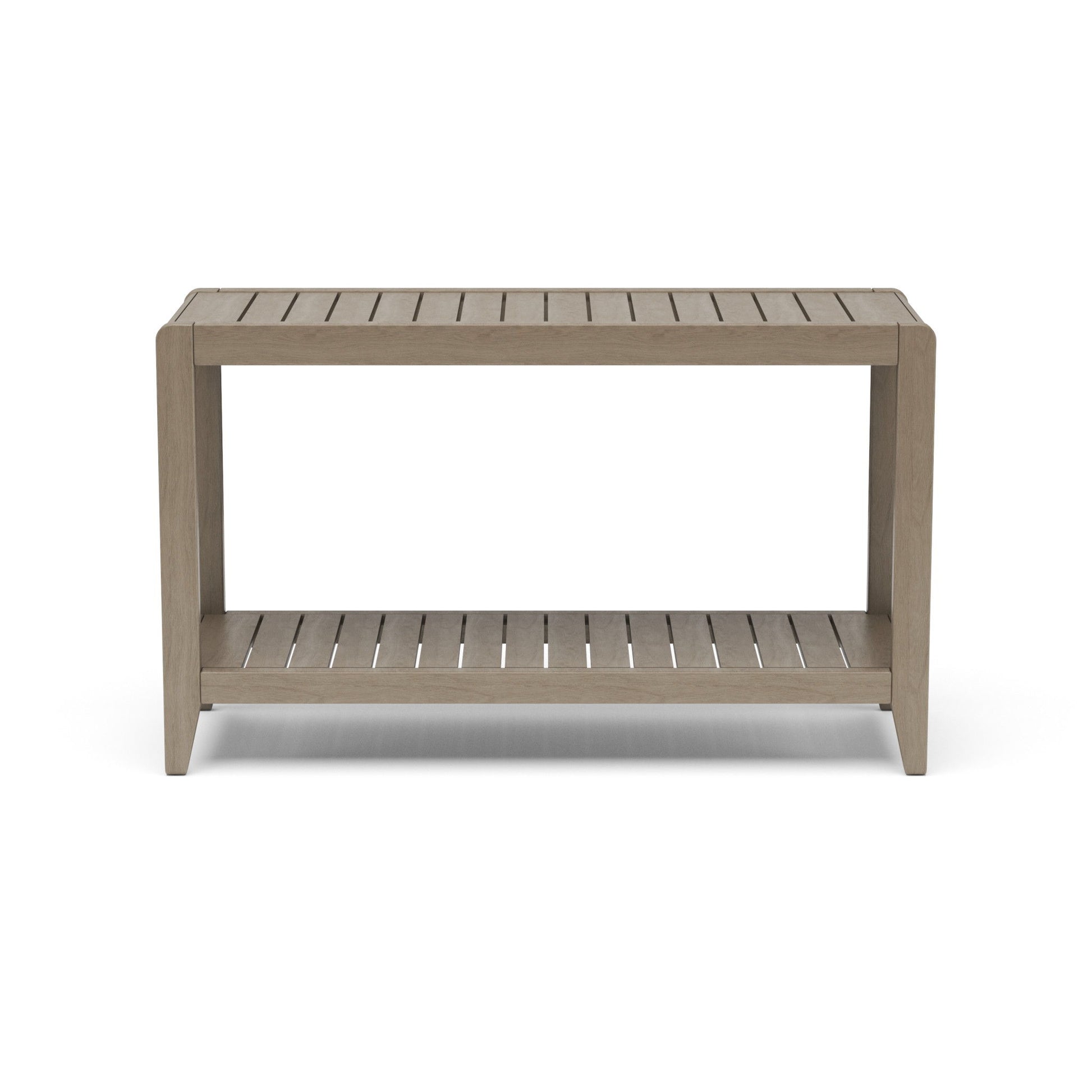 Complete your outdoor oasis and complement your sofa with this Homestyles Sustain Sofa Table. Designed to fit perfectly behind a Sustain sofa or as a serving buffet as part of a Sustain dining arrangement, this table adds functionality and valuable storage space on the lower shelf. The frame is constructed of water-resistant, gray acacia wood with a UV-resistant finish that delivers solid performance year after year.