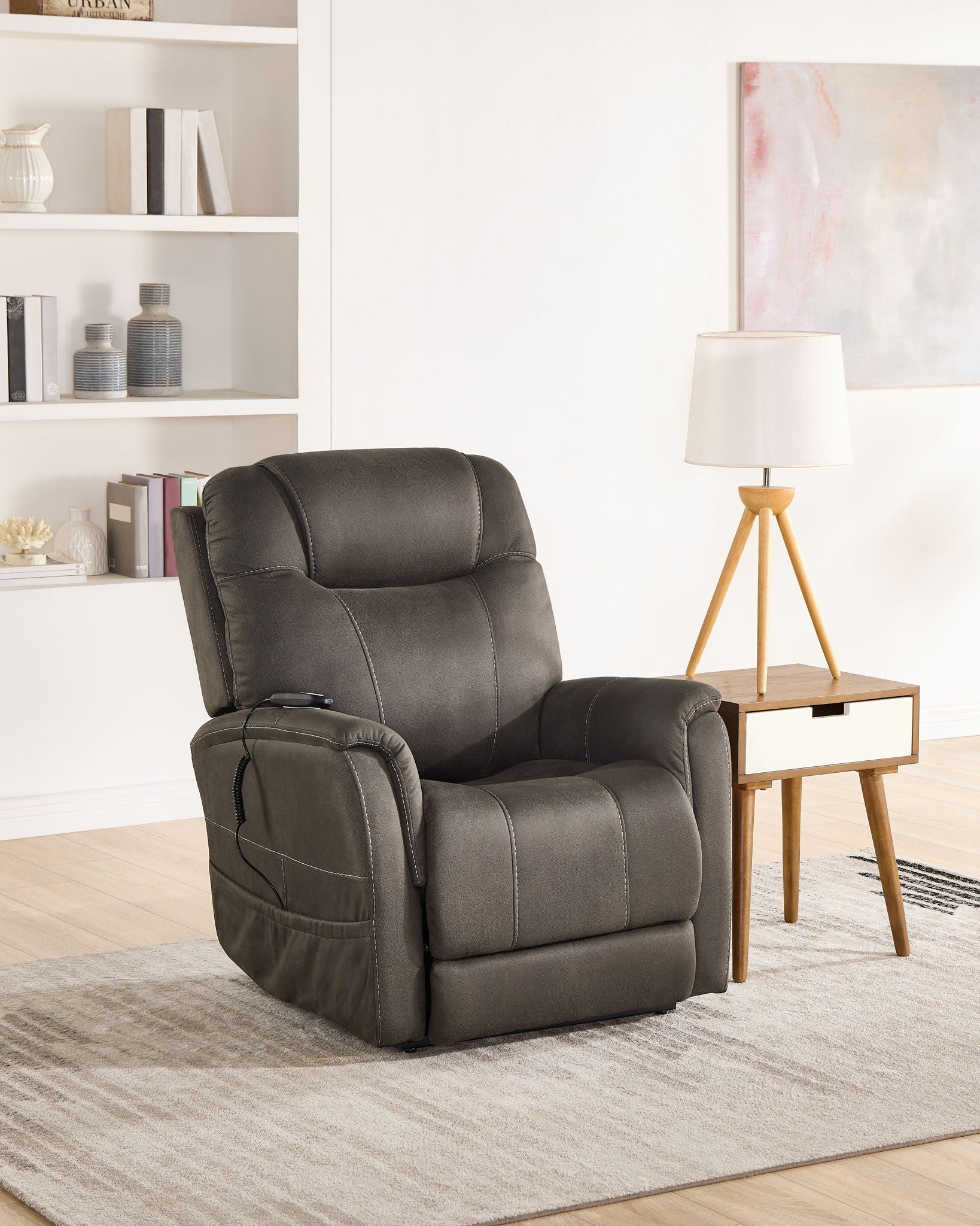 Thames offers power lift, recline and power headrest in a transitional design. This chair offers smooth assistance in and out of the seat, perfect for independence without sacrificing style. The sturdy steel mechanism and seat box construction offer unparalleled durability, while the intuitive hand-held remote ensures easy control of the lift and recline features. Coupled with a high-resiliency foam and an adaptable 3-inch footrest extension, the chair caters to your body's needs. Wrapped in an easy-to-clean walnut polyester fabric and equipped with a convenient USB port, the Thames chair supports a modern, on-the-go lifestyle while providing a timeless look that complements both traditional and modern decors.
