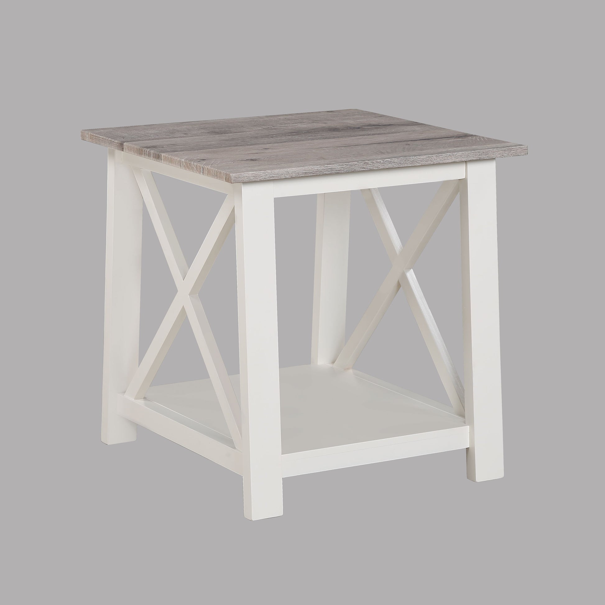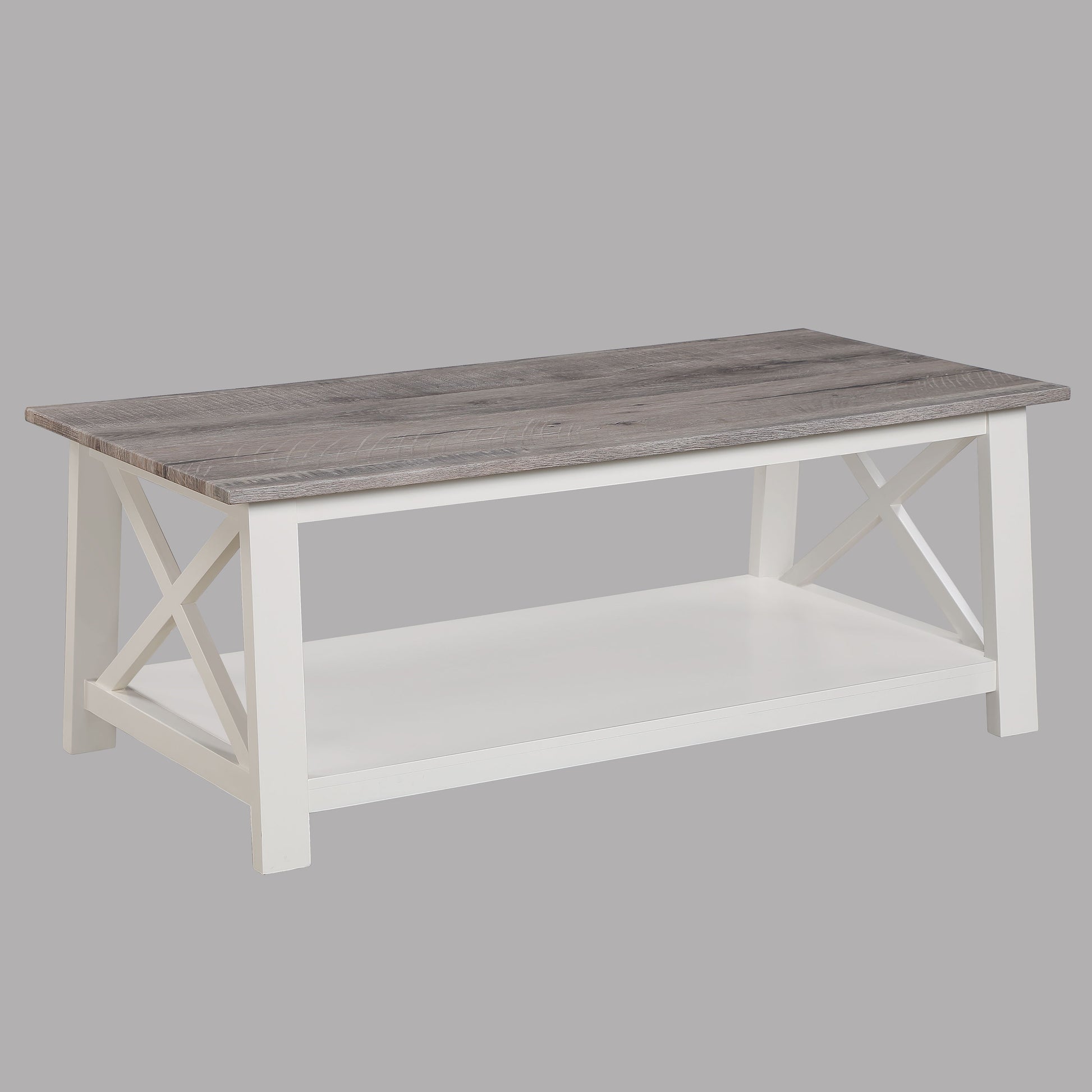 Transform your living space with this exquisite cocktail table set, featuring a perfect blend of rustic charm and contemporary elegance. Each piece is crafted with a rich, weathered gray tabletop that exudes warmth and character, contrasted beautifully by the crisp white frame for a fresh and airy look. The open shelving provides functional storage space, ideal for displaying decorative accents or keeping essentials within reach. Designed with clean lines and a timeless appeal, this set seamlessly complements any décor style, making it an inviting centerpiece for your home. Elevate your home décor with this stylish and versatile set that promises to enhance your living room’s ambiance and functionality.