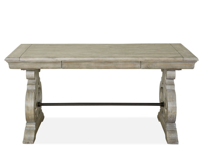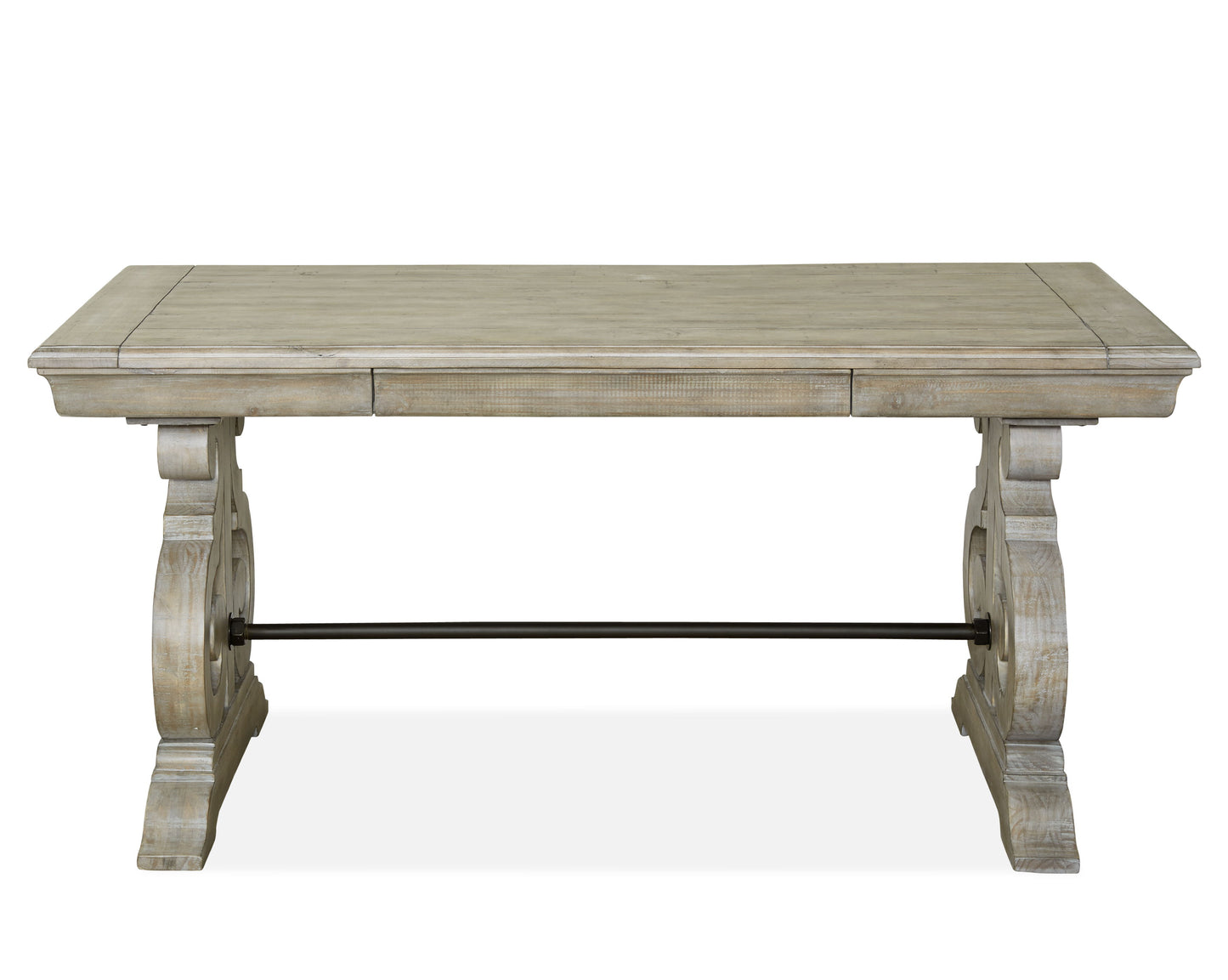 Gustavian influenced Tinley Park home office creates charming ambiance in a soft Dove tail Gray finish. Sit to the perfect work setting at one of three desk options that feature weathered pine solid tops resting atop open scrollwork bases on the writing desk, a fresh take on the executive desk with open shelf storage at the bottom and matching hutch or select the unique counter height desk, fully appointed with letter bins and small drawers on the vintage inspired hutch. Use the fully upholstered swivel desk chair the handsome counter height desk chair for comfortable work seating while an open bookcase features the open scrolled fretwork on the sides for gracious working away from work.