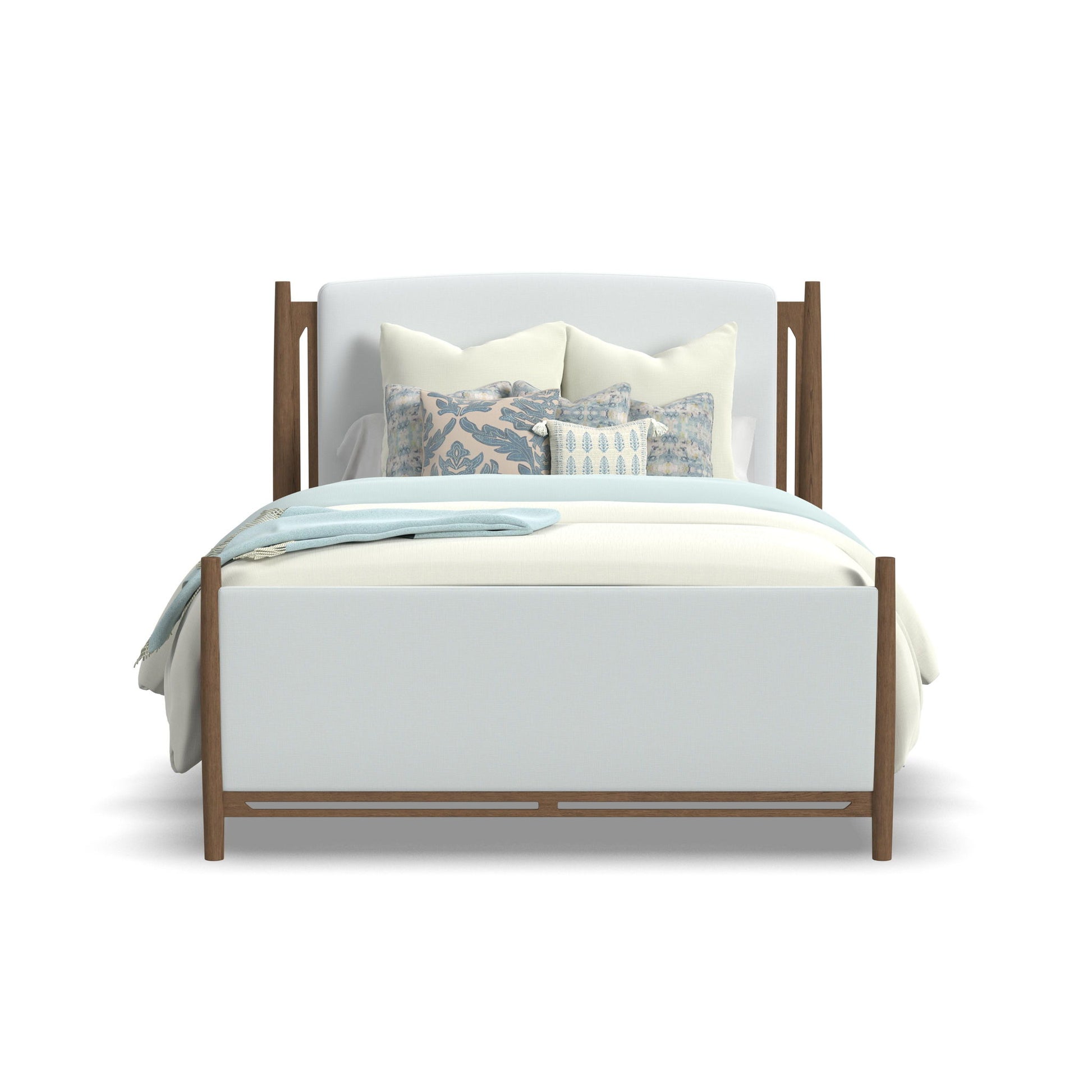 - Headboard and footboard are upholstered in a cream-colored performance fabric