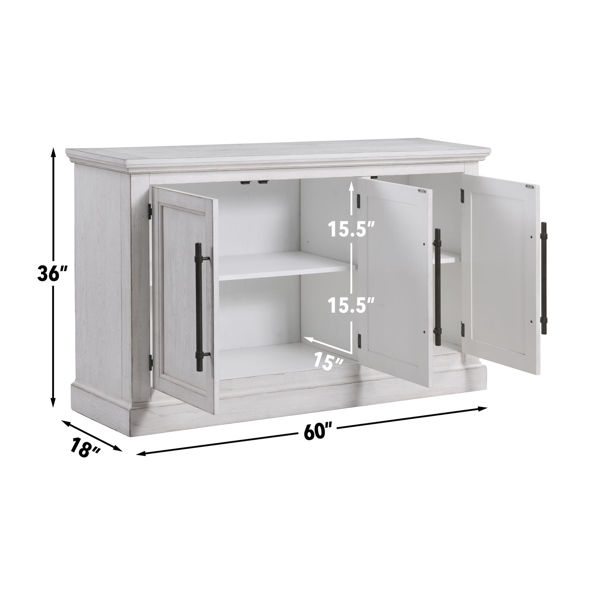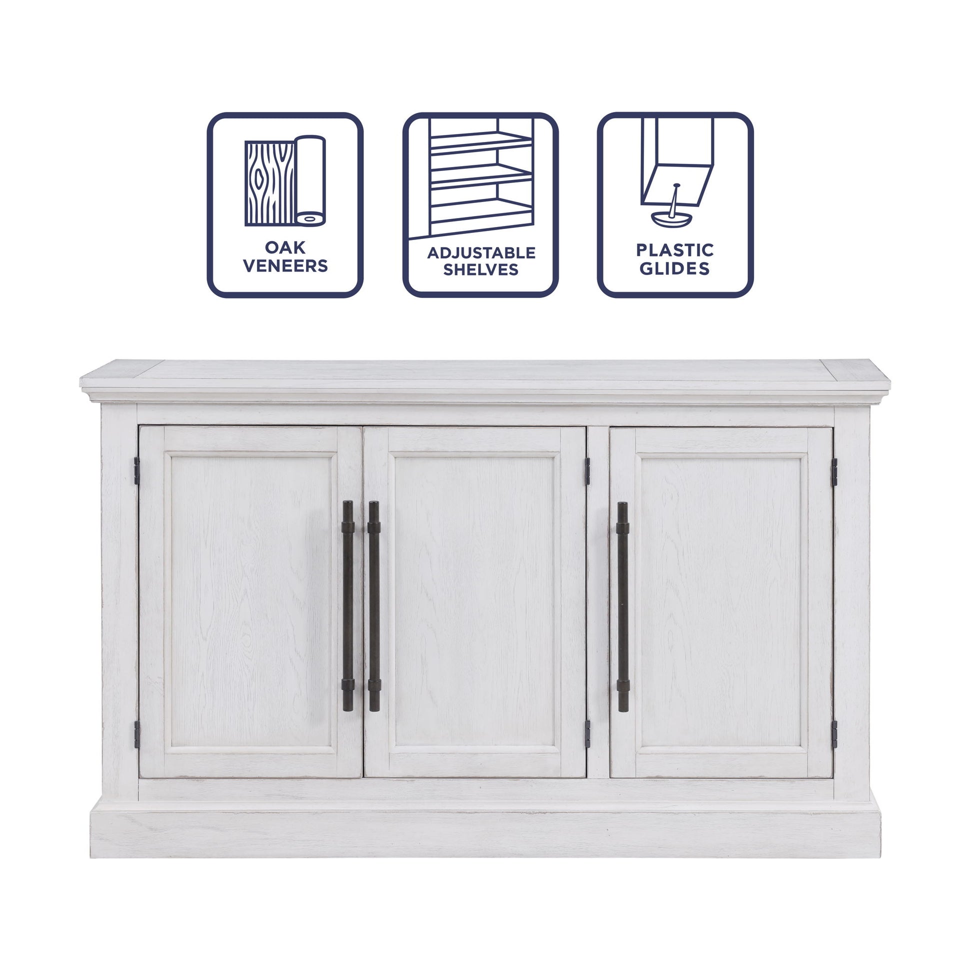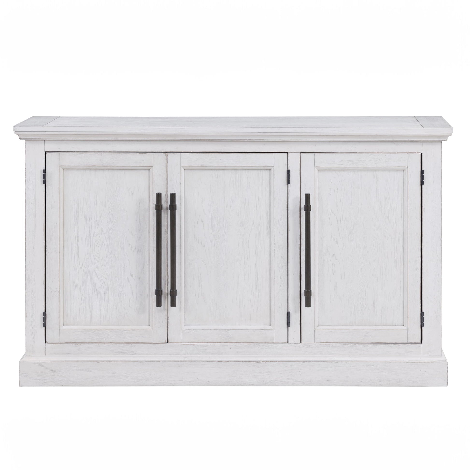 Clean lines meet thoughtful details in the Warren 60" Server. Timeless, yet modern, this Server features heavy molding, a plinth base, and picture frame doors adorned with oversized oil-rubbed brass hardware pulls, for a look that exudes sophistication. A distressed white finish with worn edges adds character to the piece, reflecting years of loving care. With three doors showcasing beautiful frontage, discover ample storage space behind, complete with two adjustable shelves for your dining essentials. Versatile enough for the dining room, hallway, or home office, the Warren Server seamlessly combines style with functionality for any space.