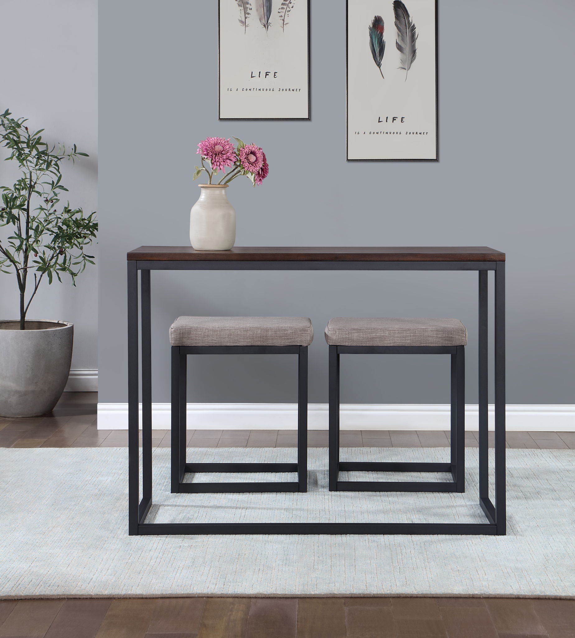 Whether for a small dining or work area or for stadium seating behind a sofa for game day, Yukon offers multiple-function uses in a compact size. Two 24-inch high stools come packaged with a 30 inch high Bar in a counter set that offers display area when not in use and extra seating when needed. A lustrous walnut finish and black metal sled base combine in contemporary lines for a sleek modern profile. Great as a hall piece for extra guest seating or as a dining area in an apartment, Yukon adds an extra dimension of style and function to any room.