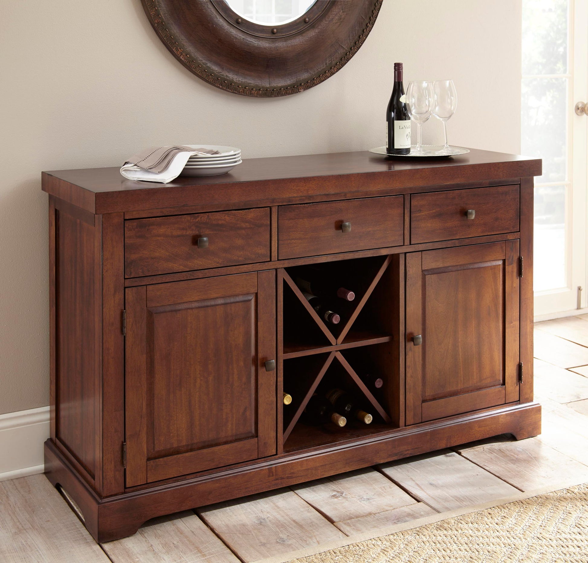 One of our most popular collections, Zappa represents the ultimate in enduring casual style and versatility. The set is constructed of hardwood solids and mango veneers in a lustrous multi-step medium cherry finish that will complement virtually any home interior. The Server features three drawers and two doors with shelves for hidden storage and features an open bottle storage compartment for display.