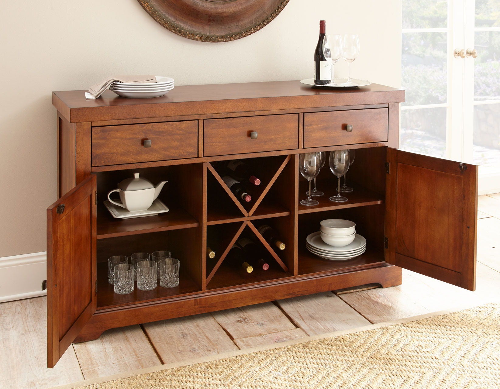 - Server features 2 doors, 3 drawers and wine storage with adjustable shelves and antique brass hardware