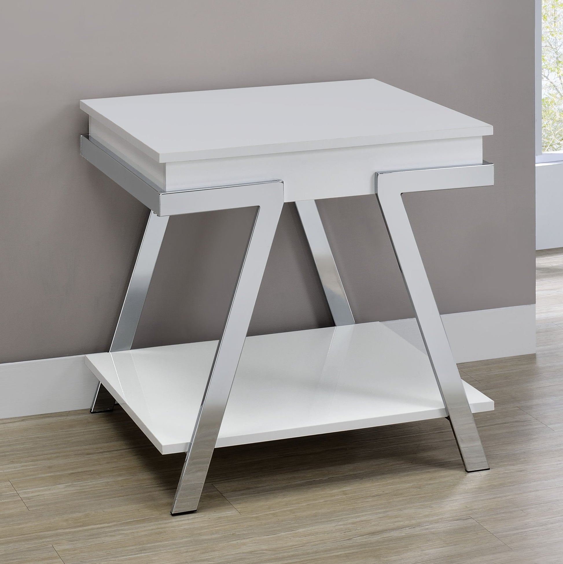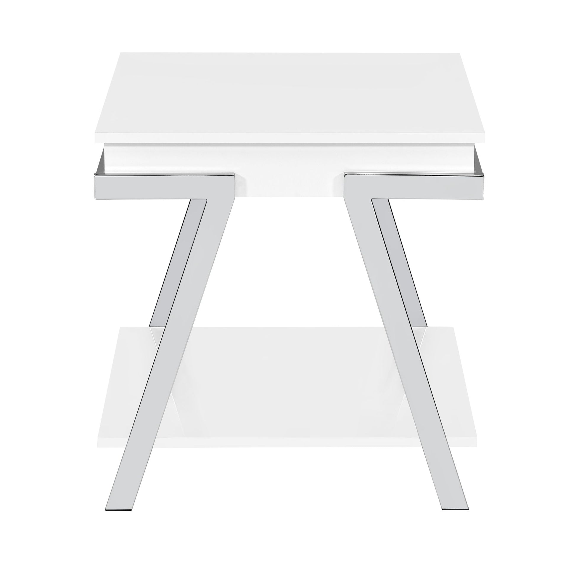 Midcentury modern design meets glam styling in the Zena End Table. Canted chrome legs frame the white finished wood center in a neutral but not boring complement to any decor. The perfect side table companion to your favorite chair, this versatile table also can be used between upholstery or as a glam nightstand. Modern and sophisticated, Zena is a great accent for any room.